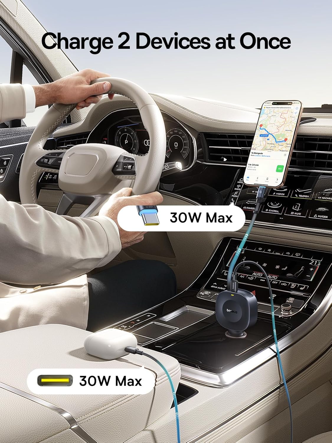 - 60W Max Fast Charging Car Charger: Power up smartphones and tablets in a flash with 30W max output from this retractable USB-C car charger. It includes a 30W USB-C cable output and a 30W USB-C port output, effortlessly ensuring your road trips and daily commutes hassle-free