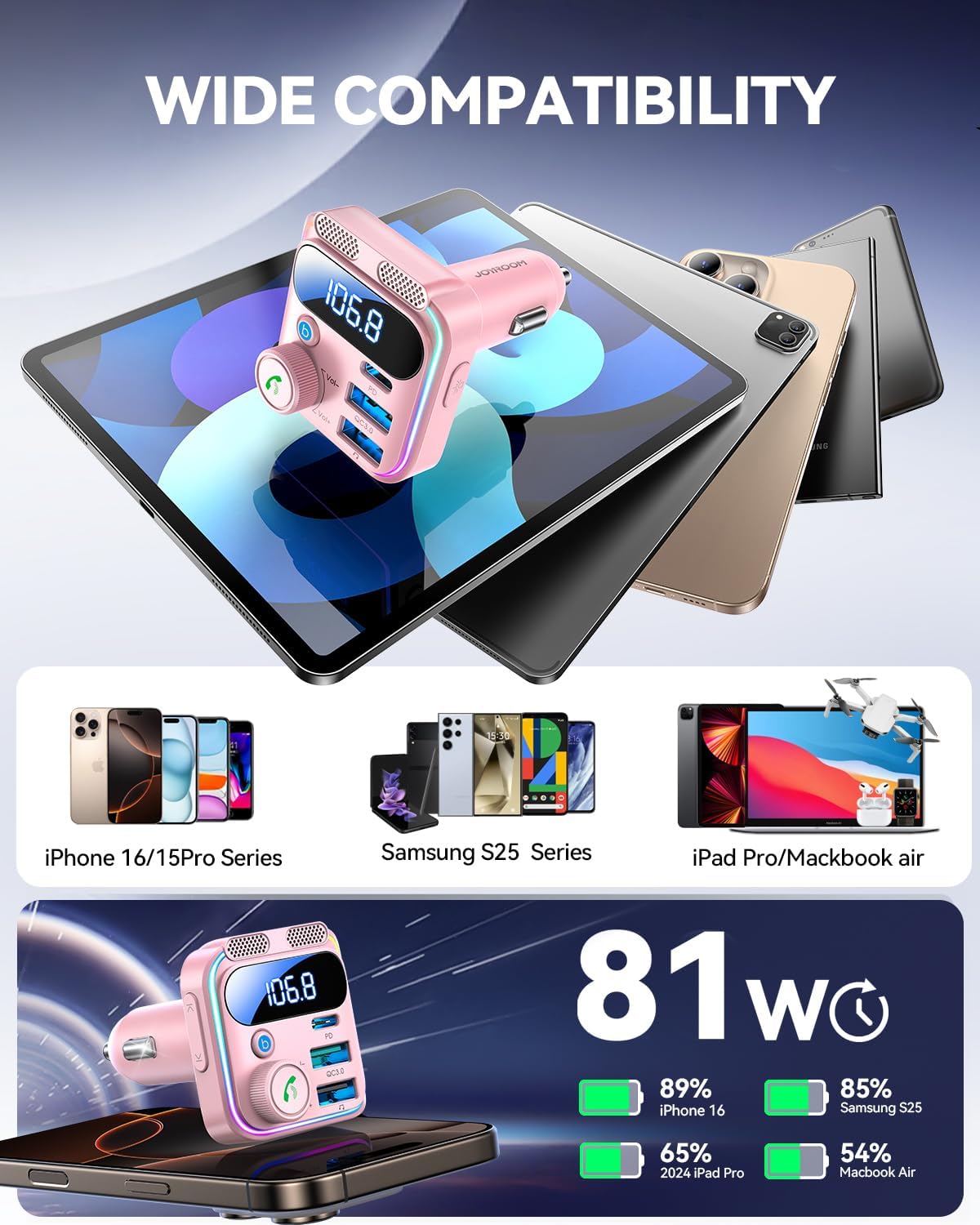 Bluetooth 5.4 Car Adapter FM Transmitter [Stronger Dual Mics & HiFi Deep Bass Sound] 81W PD & QC 3.0 USB C Car Charger Cigarette Lighter Adapter Hands-Free Calling Radio Support USB Drive