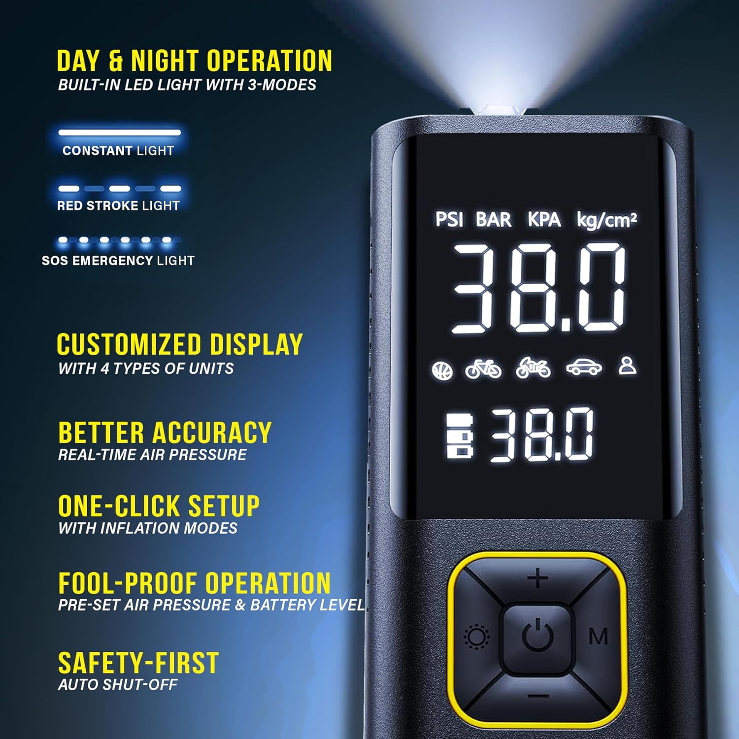 - Fast Inflation with Air Compressor- This powerful air compressor delivers up to 150 PSI and 35L/min airflow—offering 3X faster inflation speed. It can inflate a 195/65R15 tire from 29 PSI to 35 PSI in under 2 minutes. Perfect for car, bike, and motorcycle tires.