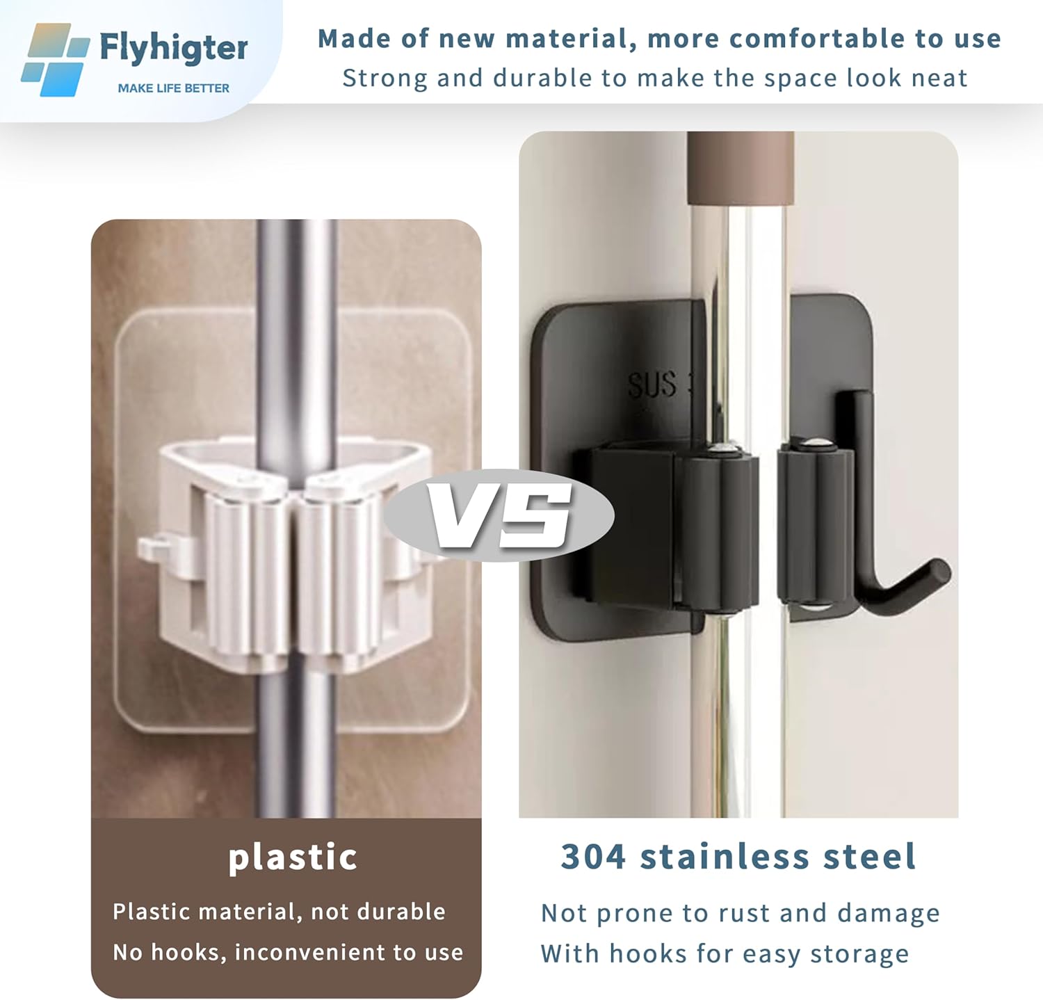 - Stainless Steel Durability for Long-Term Use Crafted from high-quality 304 stainless steel, this broom holder wall mount is rustproof, waterproof, and corrosion-resistant. It’s ideal for humid environments such as bathrooms, kitchens, or laundry rooms. Built to last and maintain its clean metallic finish over time.