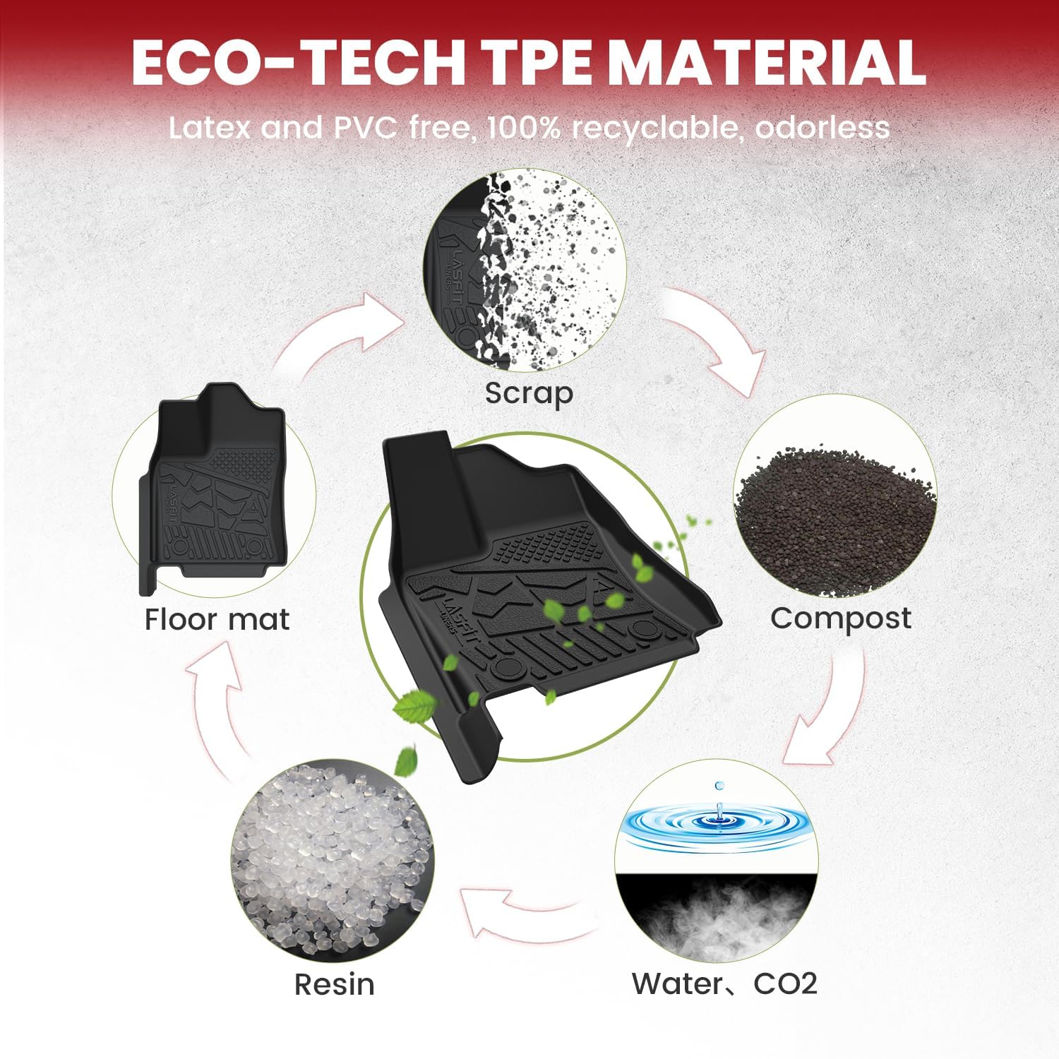- Premium TPE Material : LASFIT floor mats made of 100% brand new TPE material (Thermoplastic Elastomer) for a comfortable and soft touch and exquisite finish. More friendly to the elderly, children and pets. Exclusively designed anti-slip studs for more safety and shock and sound absorbent.