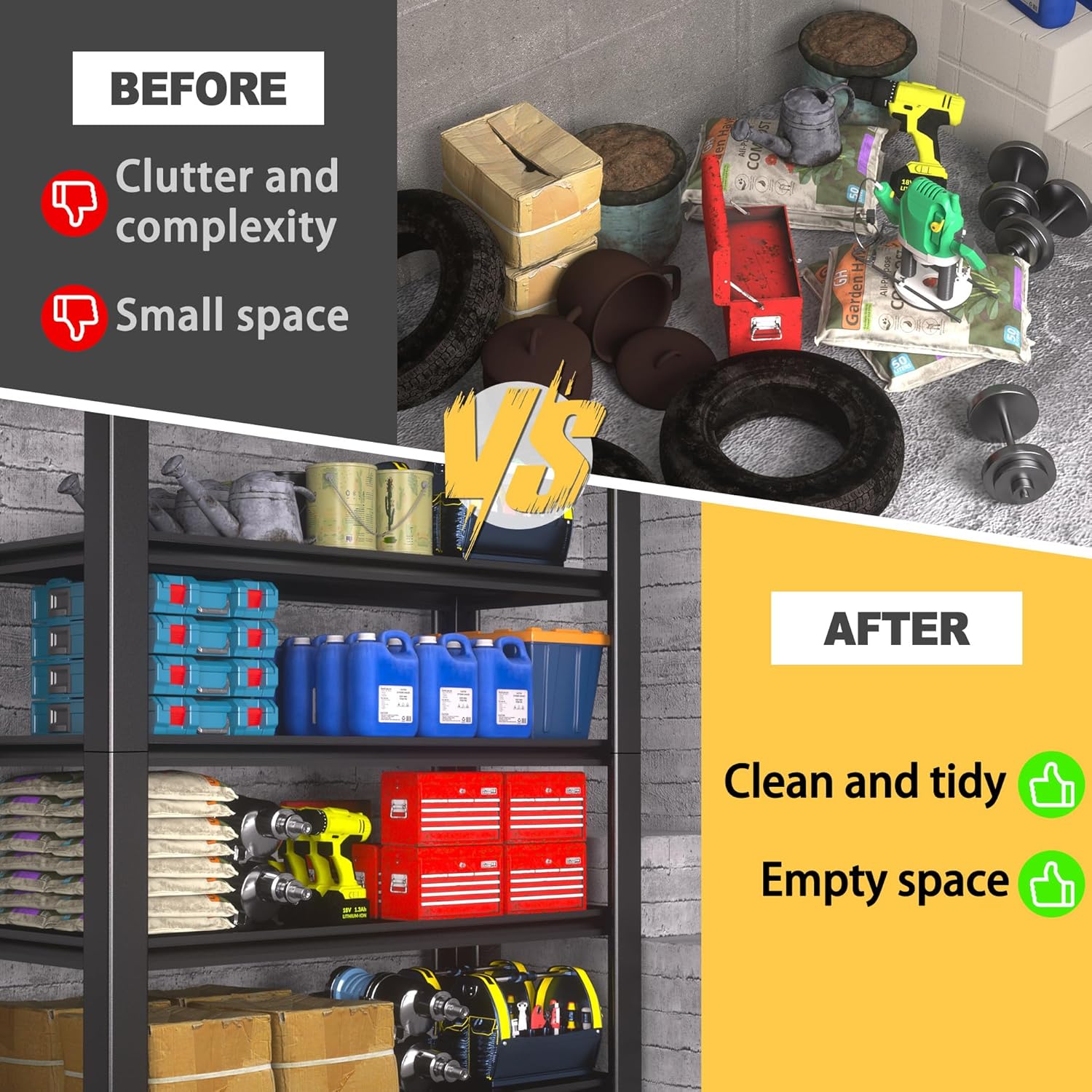 - Durable Metal Construction: Constructed from high-quality, rust-resistant metal with a powder-coated finish, this garage shelving unit is built for long-term use and maximum durability.