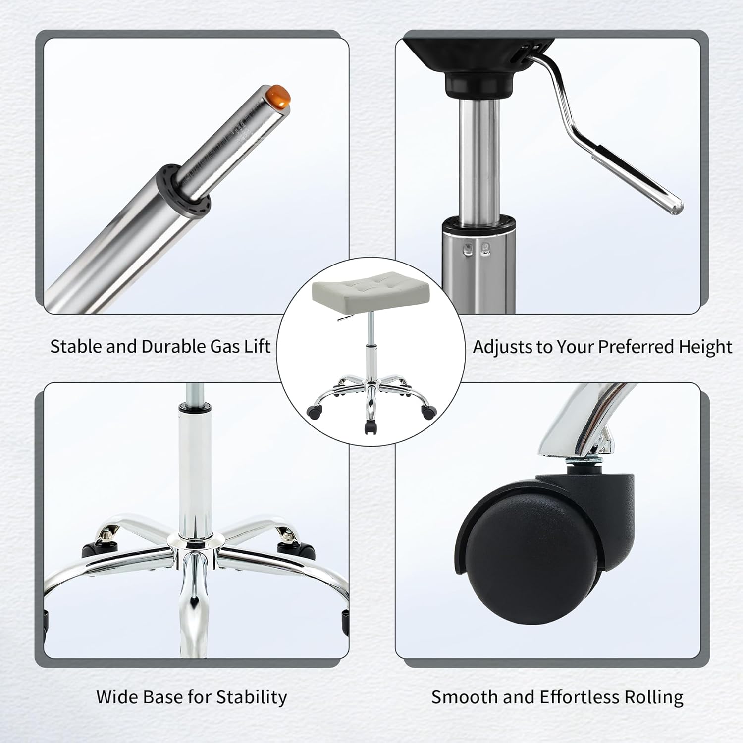 - Durable Metal Base: Made from high-strength, this base is both lightweight and sturdy. It provides stable support while making the stool easy to move, ensuring long-lasting durability and reliable performance in busy work environments