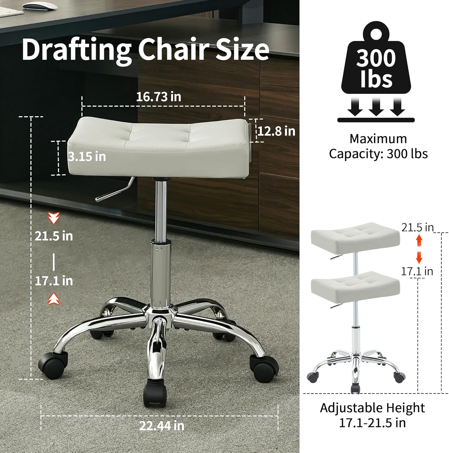 - Adjustable Height: Adjustable height range of 17 to 21 inches, this stool easily fits a variety of desks and workbench heights, ensuring comfort for users of different statures. Its versatility makes it ideal for use in offices, conference rooms, shops, warehouses, and garages