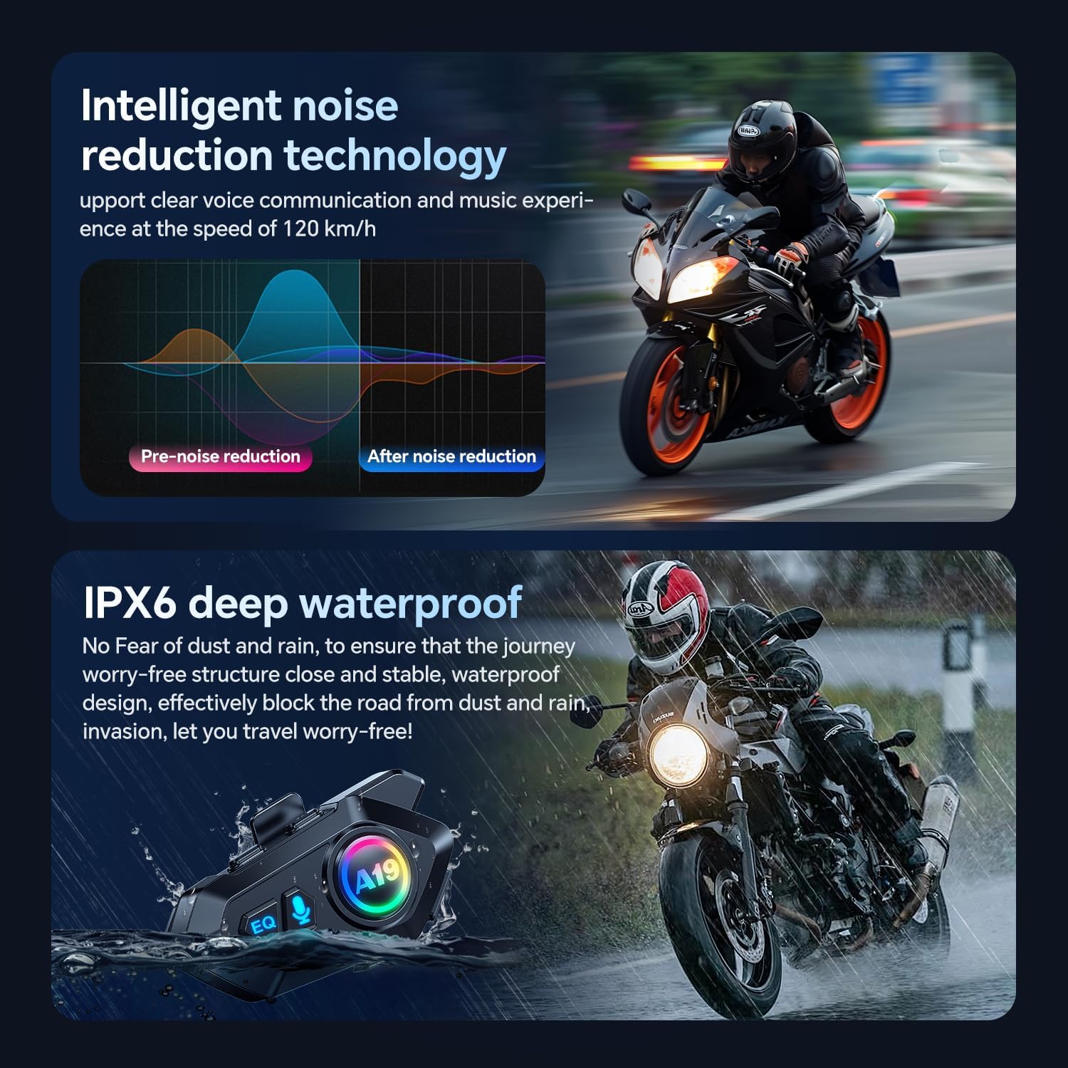 - 【IPX6 Waterproof and Playback Control】The New A19 Motorcycle Helmet Speakers is IPX6 waterproof help you handle all weather conditions, such as dust, rain, storm, snow, and low temperature of -20°F. Motorcycle headset also offers convenient and quick functions like voice assistant, automatic answering, and redialing the last number. Ensuring a smoother and safer riding experience,and avoiding dangerous repetitive operations!