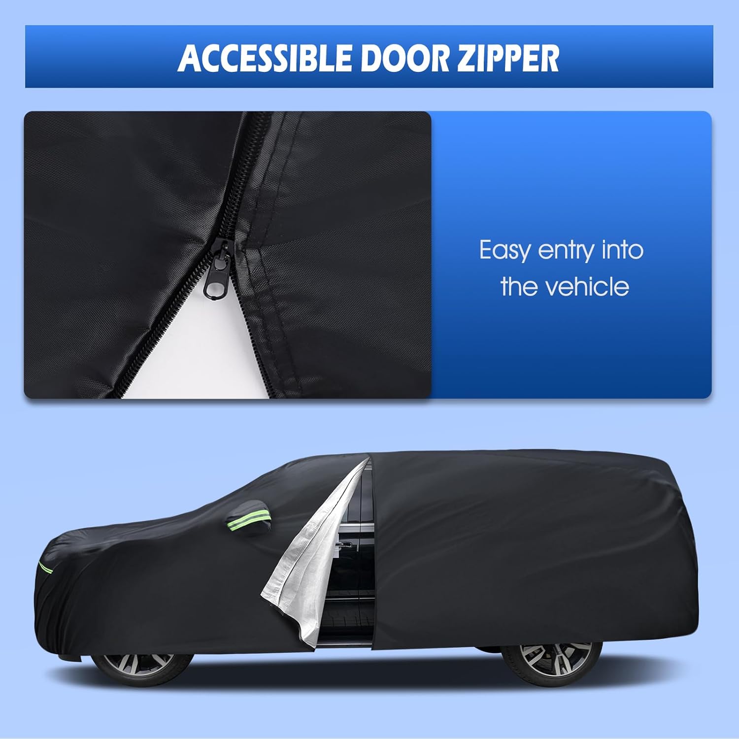 - Safe and convenient design: 1) The driver position of the Migaven full cover has a zipper, allowing you to enter the car to retrieve items at any time without removing the cover. 2) Equipped with six reflective stripes, fully covered reflective stripes to remind others at night to ensure parking safety. 3) The cover is equipped with a mirror pocket, which perfectly protects your mirror and avoids damage. 4) Comes with a storage bag for easy placement.