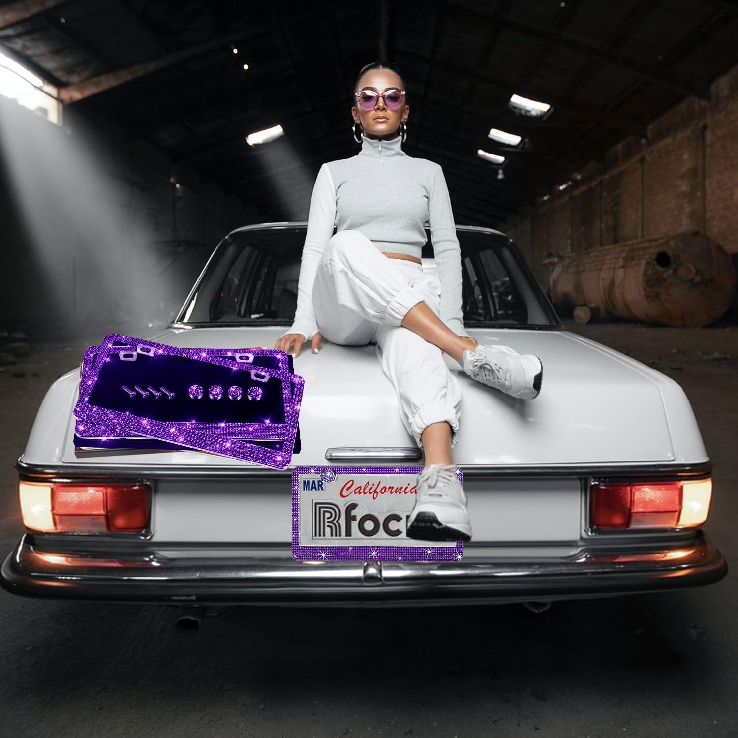 2 Pack License Plate Frames for Women, Sparkly Rhinestone Diamond Car Accessories with Glitter Crystal Caps (Violet(2PCS))