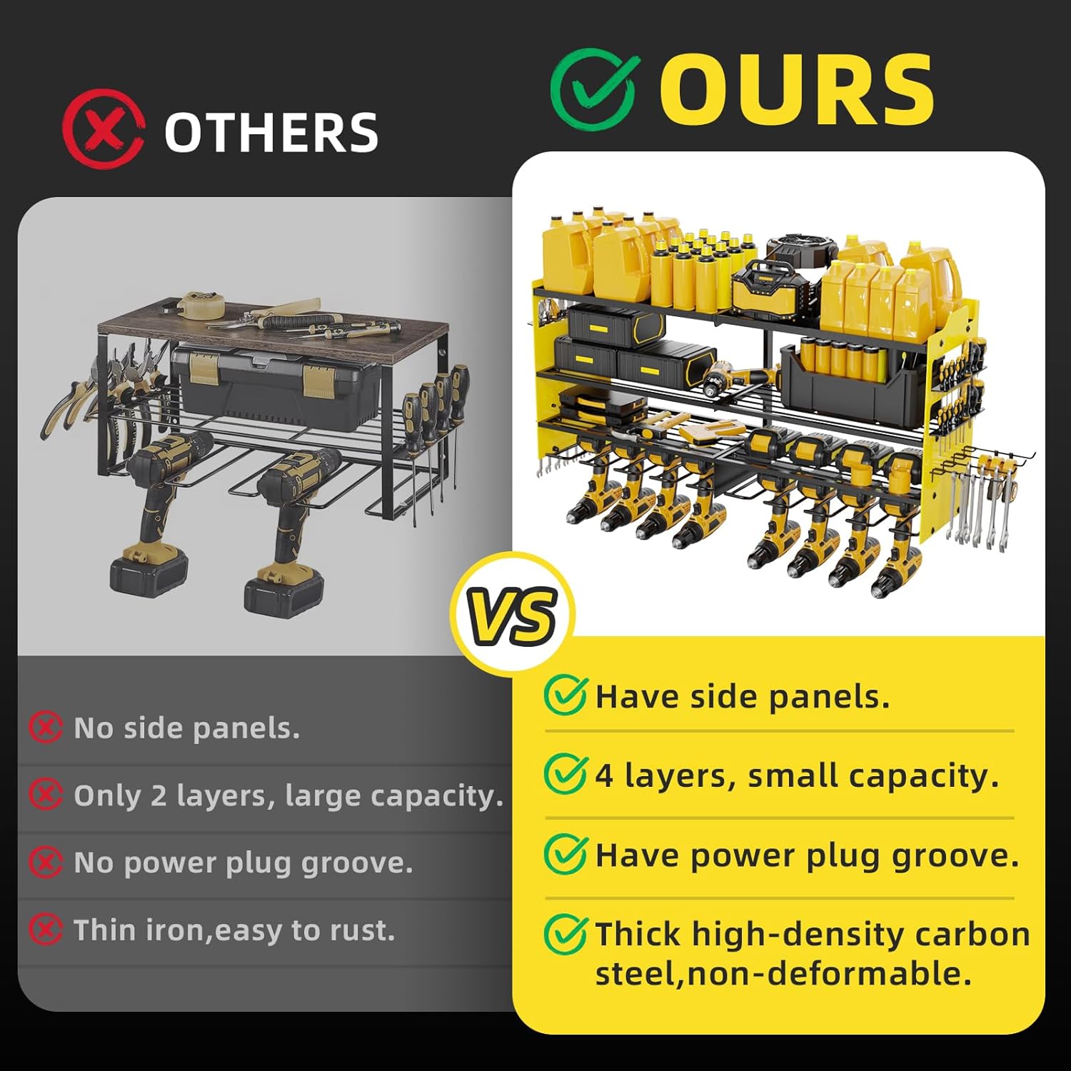 - 🔨【600 POUNDS LOAD】This heavy-duty power tool organizer is made of heavy-duty metal and protective coating,scratch-resistant, rust-resistant and anti-bending,no need to worry about the shelf breaking or falling off the wall. The wall mount design saves valuable floor space while keeping tools within reach,say goodbye to a messy workspace,put your tools all in a row.
