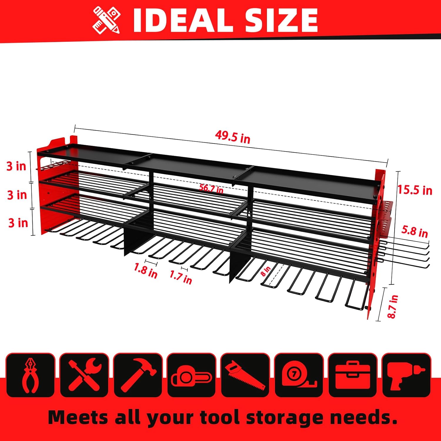 - 【800 POUNDS LOAD】This heavy-duty power tool organizer is made of heavy-duty metal and protective coating,scratch-resistant, rust-resistant and anti-bending,no need to worry about the shelf breaking or falling off the wall. The wall mount design saves valuable floor space while keeping tools within reach,say goodbye to a messy workspace,put your tools all in a row.