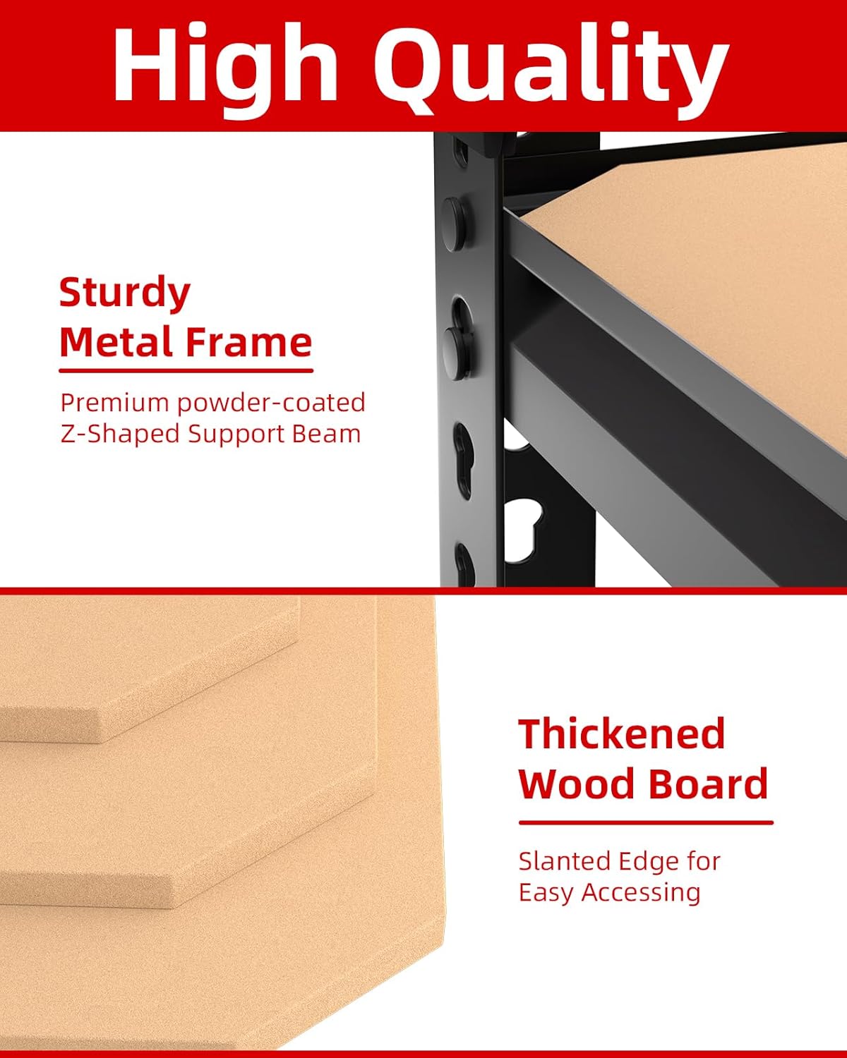 - ăThicken Heavy Duty Metal Storage ShelvesăPrimeZone garage shelving is composed of high-quality metal frames with powder-coated finished and thickened wood boards. Each shelf add 2 additional middle support beams. The heavy duty shelving has a load capacity of 650 lbs per tier, and a total load capacity of 3250 lbs for 5 tiers storage rack.