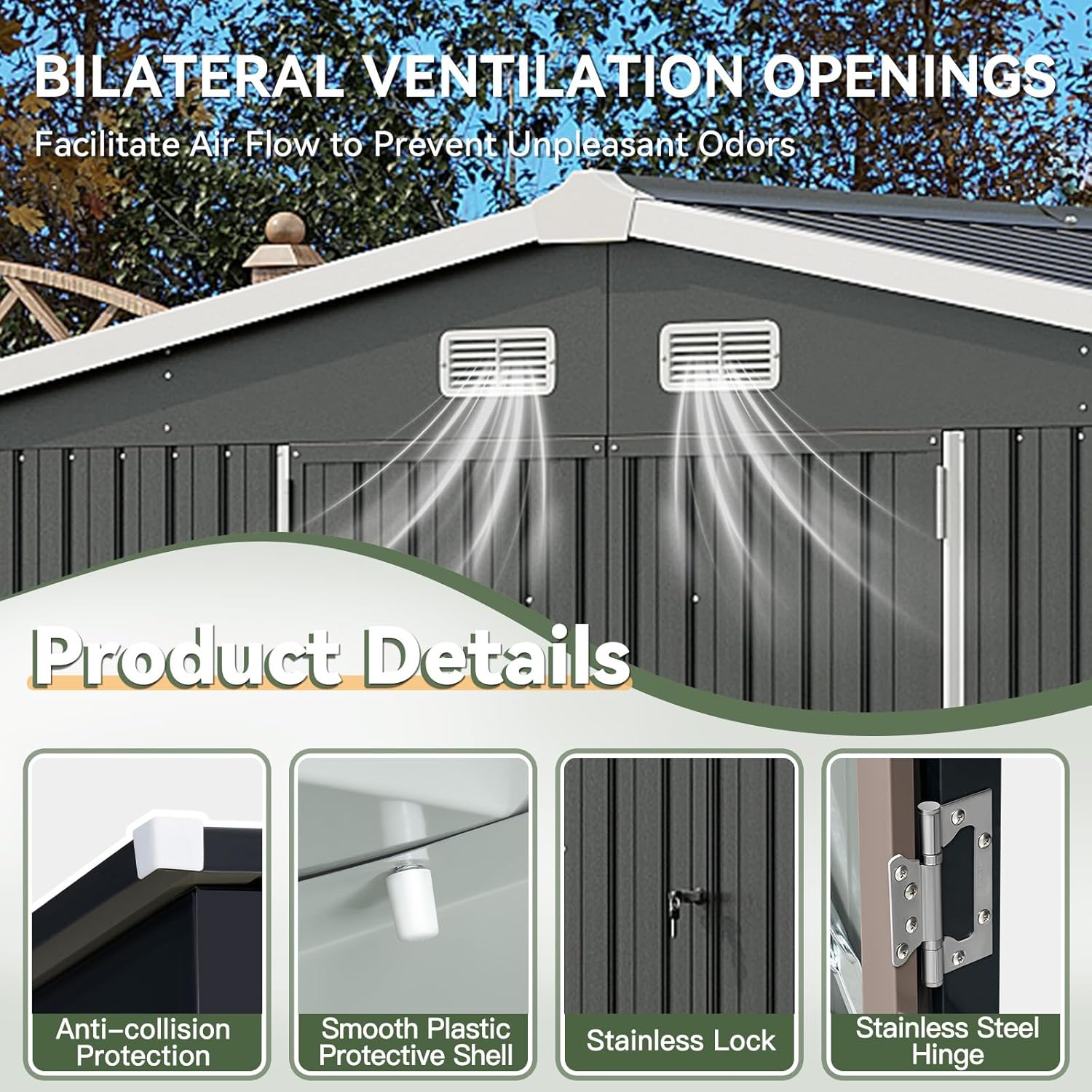 - Durable Large Shed: Galvanized steel, waterproof, withstands harsh weather for long life. Thick metal roof & walls ensure that it will not deform for a long time use. All structures have undergone rigorous structural engineering design, even in heavy snow and wind weather, it can be leisurely