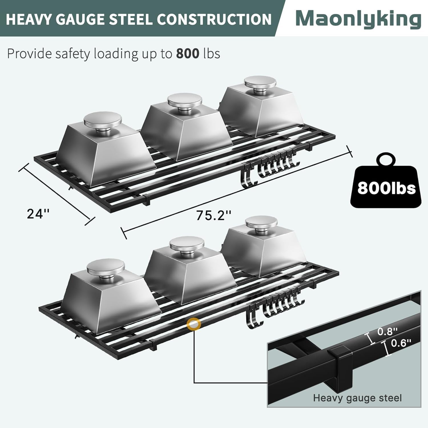 - 【Optimal Space Utilization Design】The unique addition of hanging rods and hooks on the hanging storage racks for garage expands the user's storage space; You can place idle items on hanging rods and hooks to achieve the maximum utilization of space. Each hook included in the package has a weight capacity of 50 lbs; The black metal wall storage shelf is suitable for garages, shops, laundry rooms, kitchens, and even industrial purposes, you can rely on their storage space and load-bearing capacity