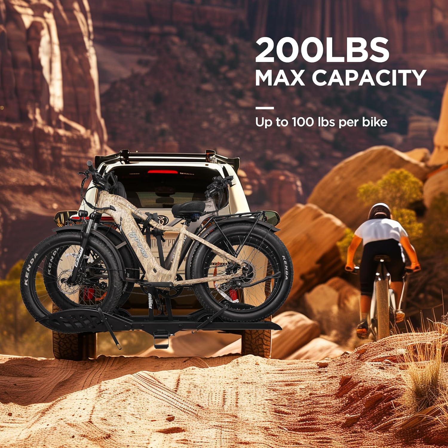 - HIGH CAPACITY FOR EASY LOADING: Made from high-strength alloy steel and aluminum, this Rockland ebike rack is durable and powerful enough to carry 2 ebikes / fat tires / mountain bikes / ordinary bikes weighing up to 200 LBS (100 LBS per tray). It fits any vehicle equipped with a 2-inch receiver and supports ebikes up to 5"" wide and with a wheelbase up to 50"", accommodating nearly all kinds of the ebike models on the market.