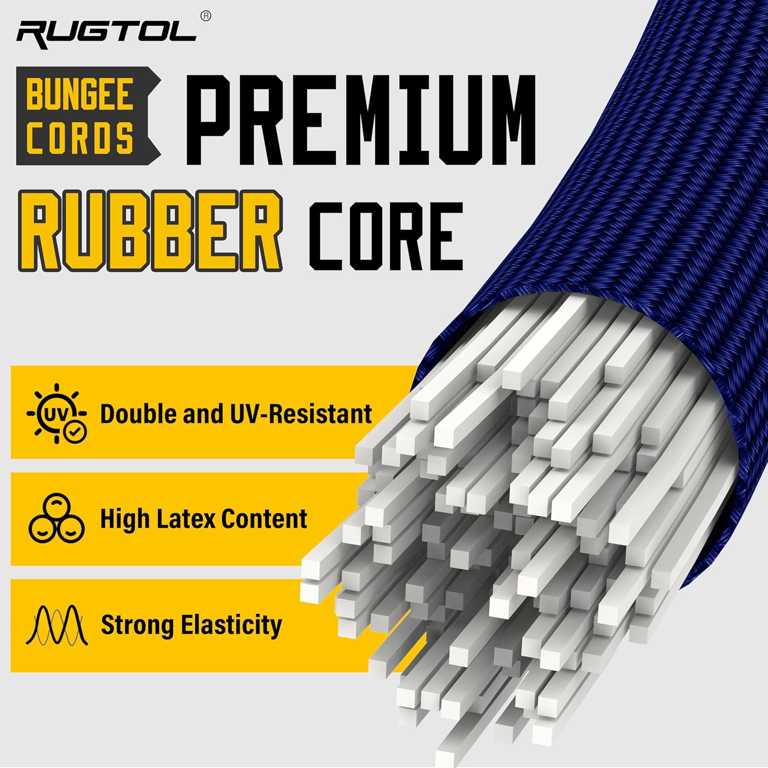 - Super Elasticity and Durability Bungee Cords: Rugtol adjustable heavy-duty outdoor bungee cords are made from a UV-resistant, high-quality Thai latex and cross-woven rubber blend, offering superior elasticity that stretches up to 1.7x to 2x its original size. Unlike ordinary rubber bungee cords with hooks, these bungee cords maintain flexibility without becoming thin or brittle. The rust-resistant carabiner hooks are made with advanced electrophoretic coating technology.