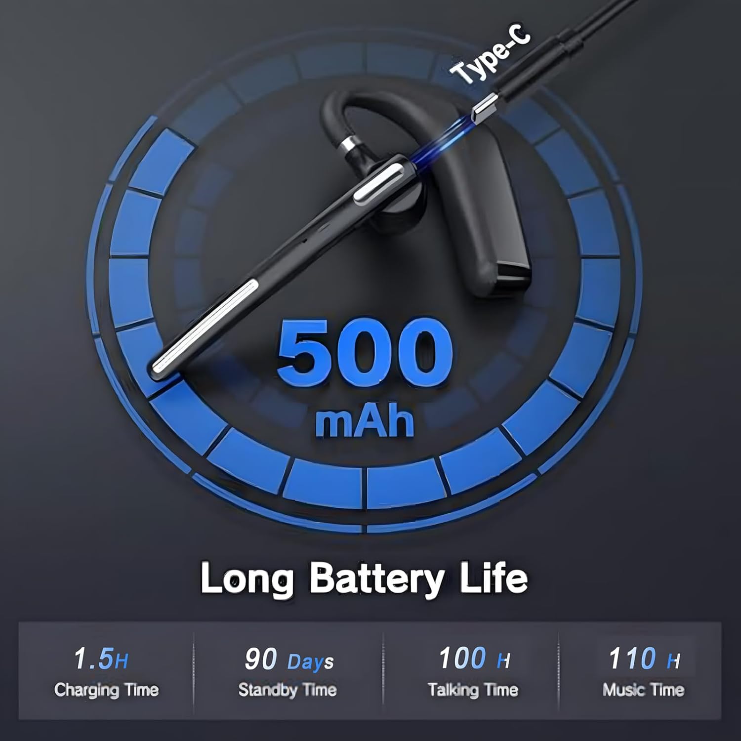 - 【500mAh big battery 】 The 500mAh battery provides up to 100 hours of talk time, 110 hours of music playback, and 90 days of standby. The phone ear piece wireless bluetooth charges fully in just 3 hours via Type-C and keeps your bluetooth ear piece powered for days—ideal for truck drivers and remote workers