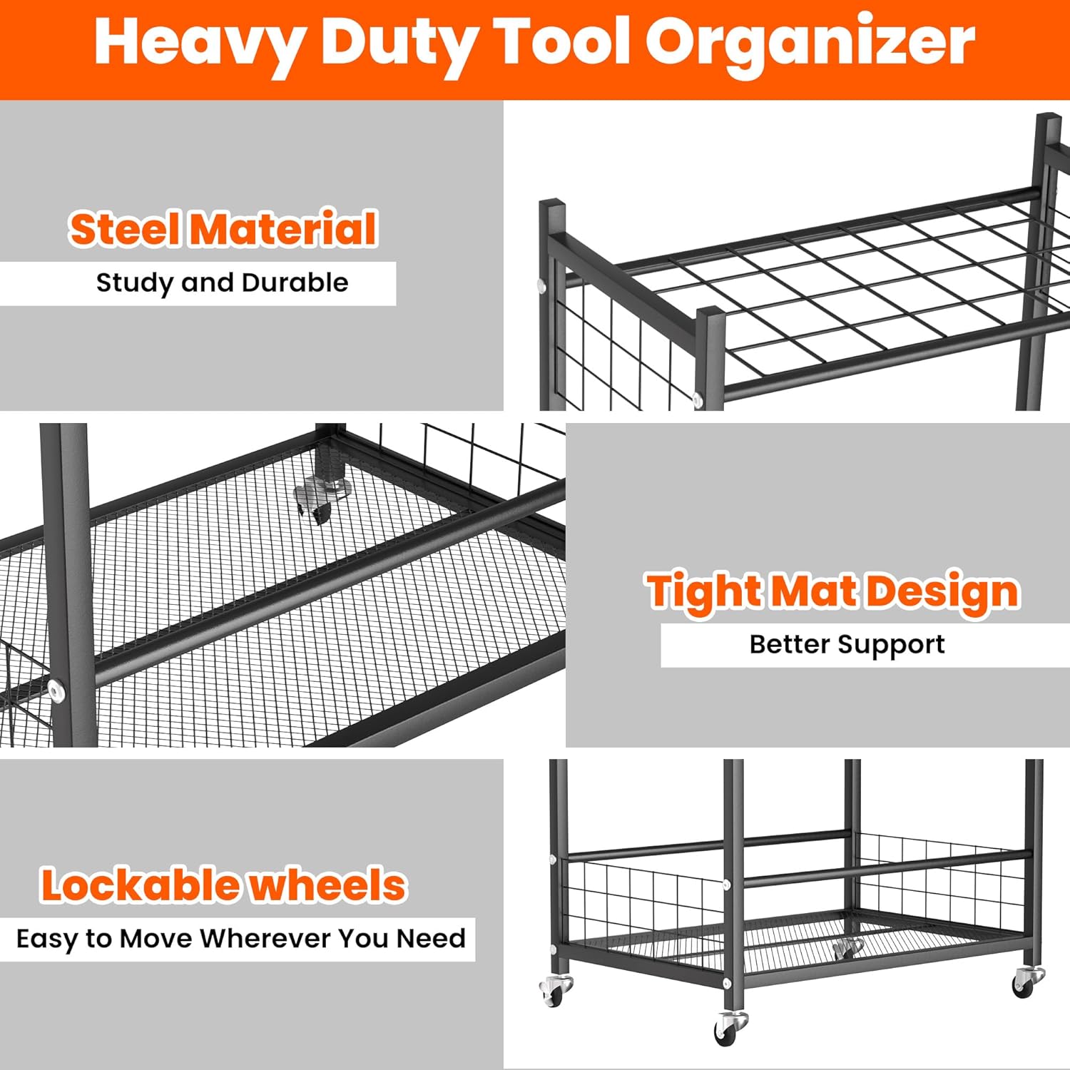 - Lockable Wheels: Equipped with 4 wheels, this gardening tool organizer can be moved effortlessly. Two of the wheels have a locking feature to keep the organizer stable and stationary when needed