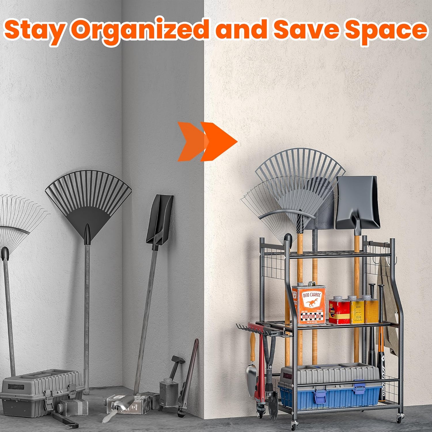 - Efficient Space Management: This yard tool organizer features multiple slots and three shelves for storing tools like rakes, shovels, and brooms. Its compact design maximizes space, with additional hooks for additional storage