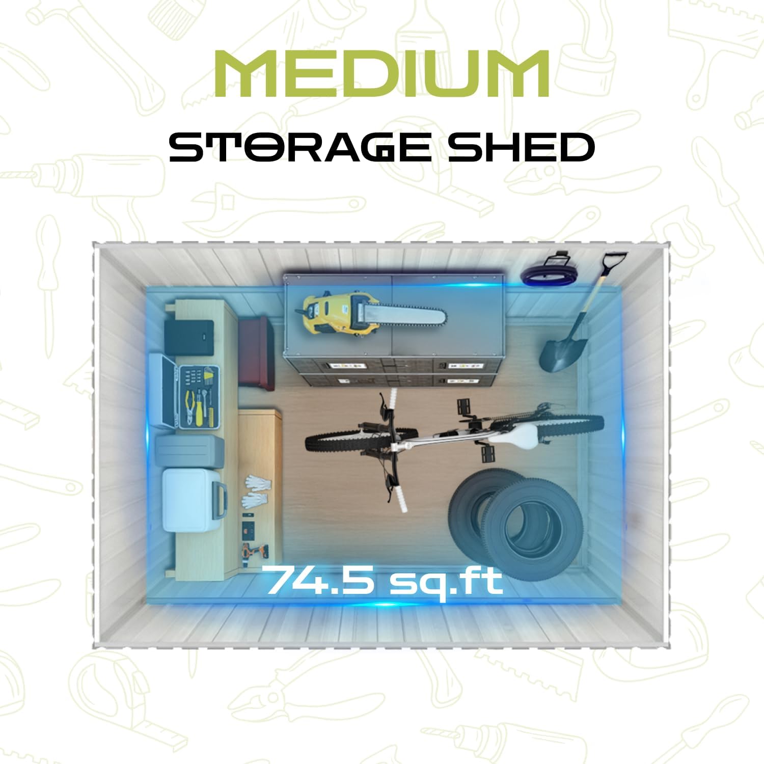 - 【Spacious & Multi-Functional】This 77.35 sq.ft outdoor storage shed offers versatile space for gardening tools, seasonal gear, or as a compact workshop, featuring 4 vents and a translucent window to prevent humidity damage