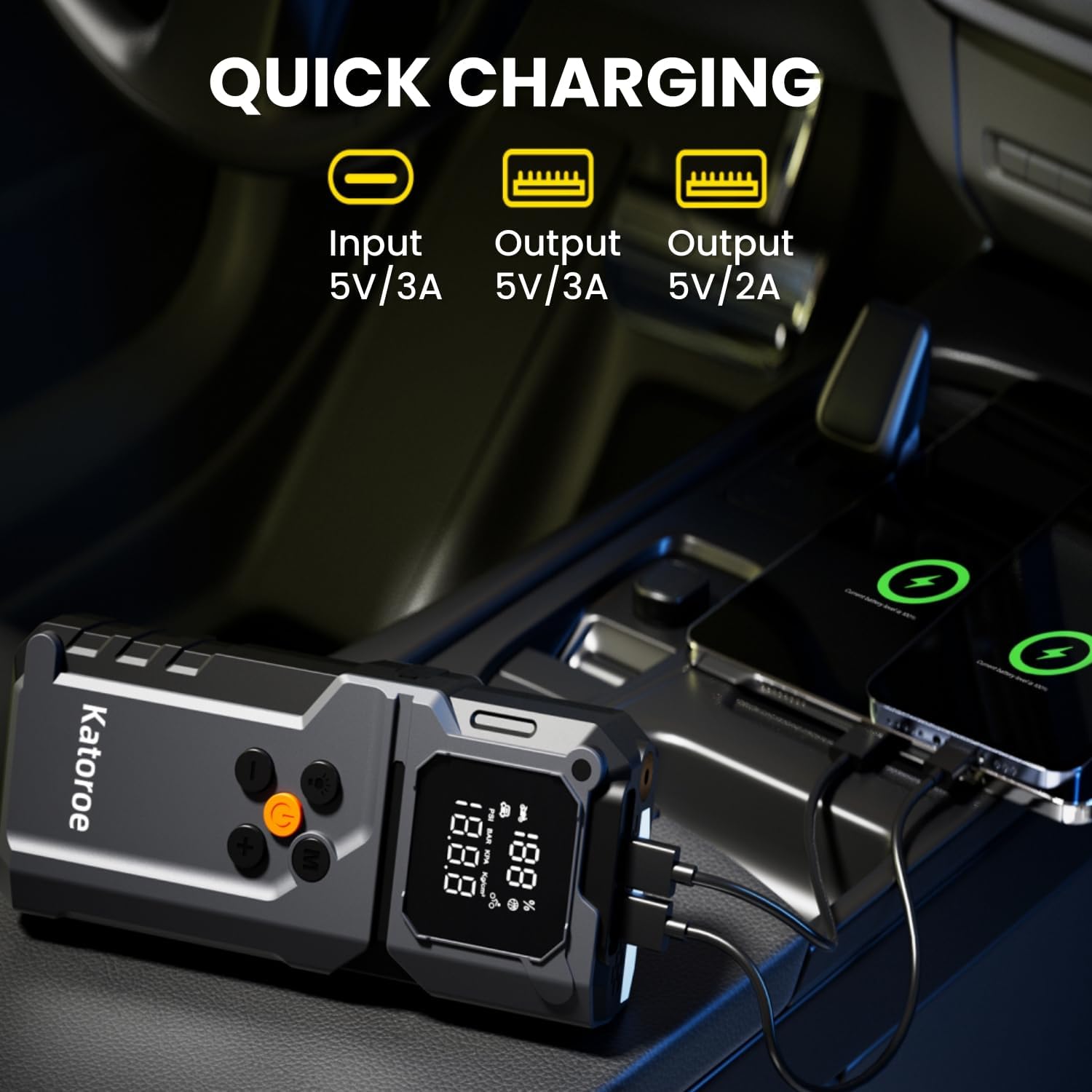 - Dual Charge Devices - The jump starter equipped with a powerful 16000mAh battery, Featuring one Type-C input port (5V/3A), two USB-A output ports (5V/3A and 5V/2A), efficiently charges various devices such as smartphones, laptops, and tablets, making it a ideal choice for traveling or camping.