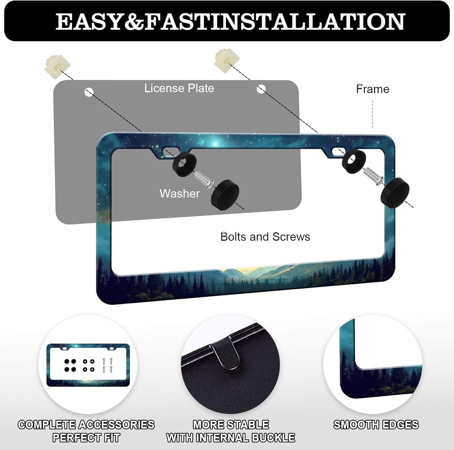 Starry Sky Mountain License Plate Frames - 2 Pack Green Mountain Forest Stainless Steel License Plate Holder,Rust-Proof Waterproof Car Decorative Tag Frame with Screws Fasteners Caps