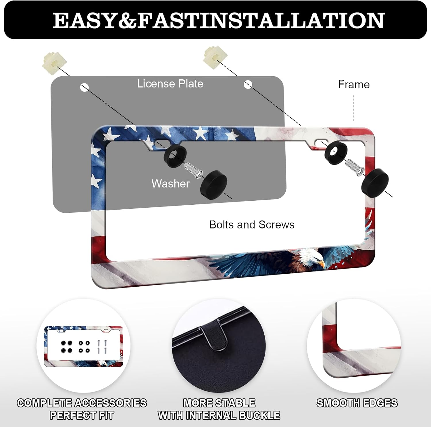 American Flag Eagle License Plate Frames - 2 Pack US Flag Patriotic Stainless Steel License Plate Holder,Rust-Proof Waterproof Car Decorative Tag Frame with Screws Fasteners Caps