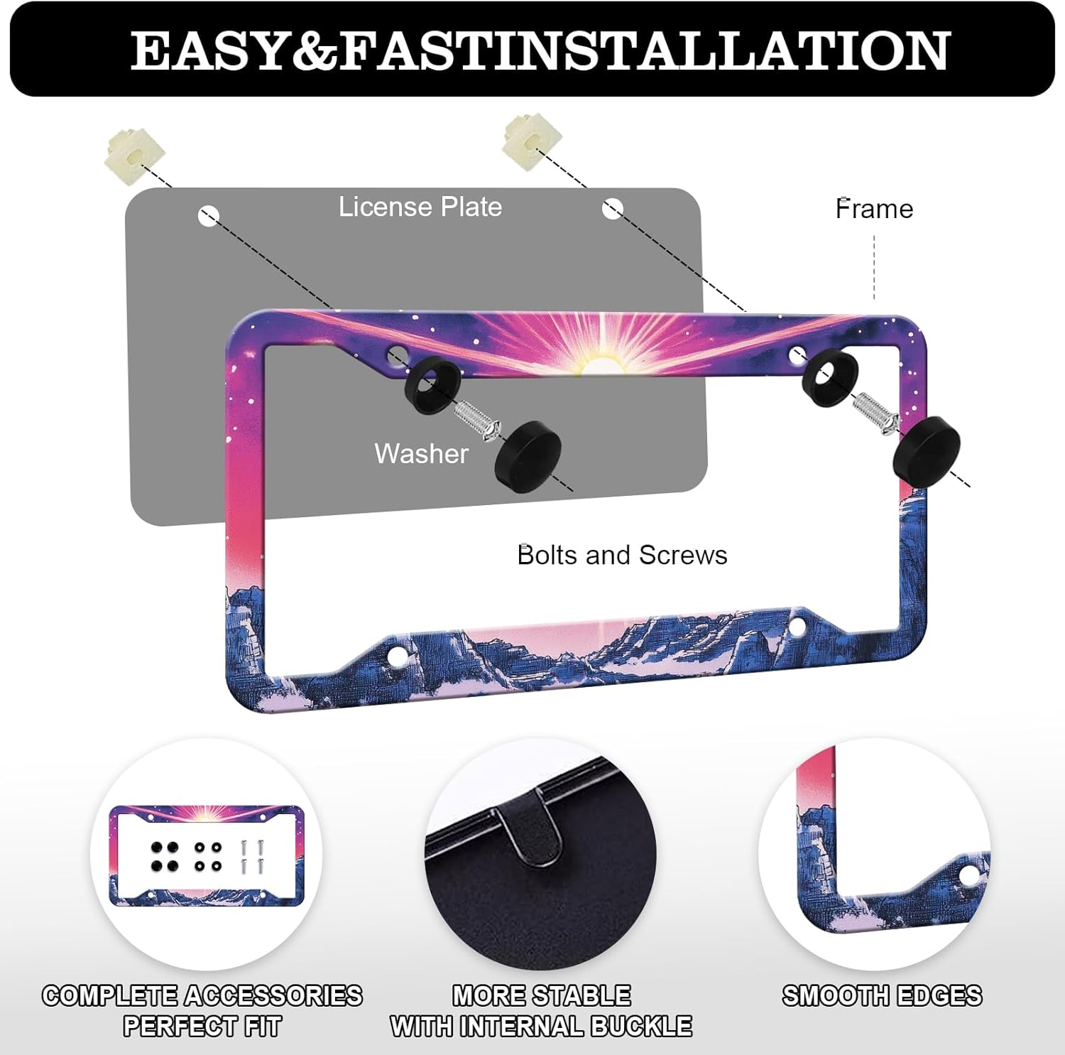 - Easy to Instal:The 4 holes license plate frame is more secure. This car license plate frame includes accessories,nuts, anti-theft screws, and comes with installation hardware. The license plate frame is easy to install without any tools
