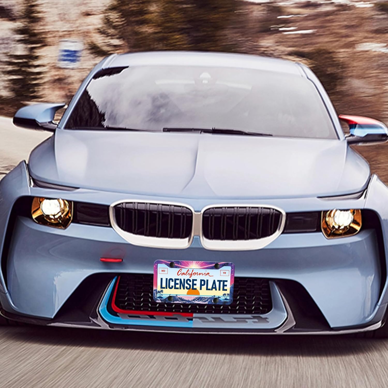 Sunset Mountain Anime License Plate Frames - 2 Pack Magic Colorful Stainless Steel License Plate Holder,Rust-Proof Waterproof Car Decorative Tag Frame with Screws Fasteners Caps
