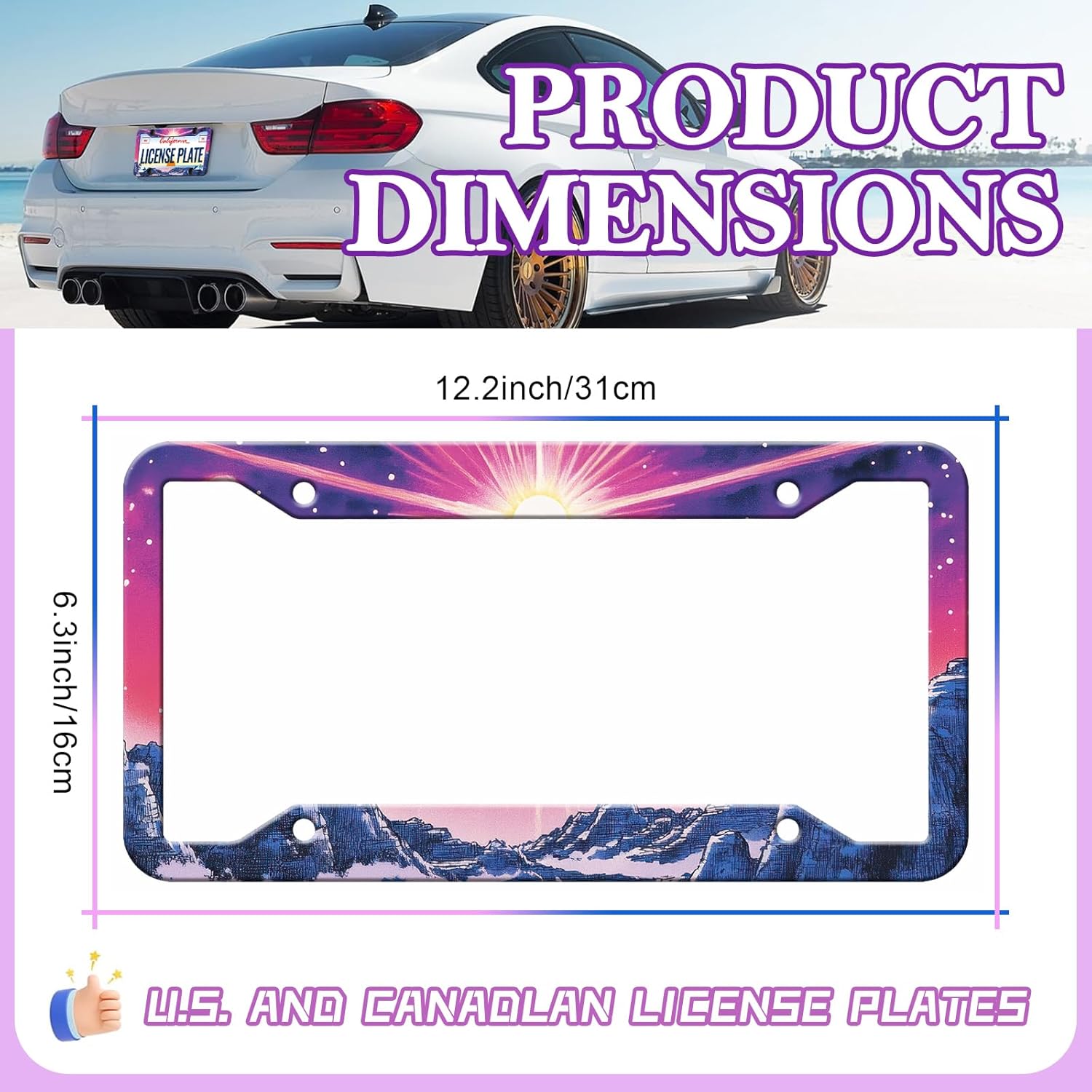 - Standard Car Tag Frame Size: The license plate frame measures 12.3 x 6.3 inches and fits standard US and Canadian license plate frames; Make your car more stylish, and stand out from the crowd