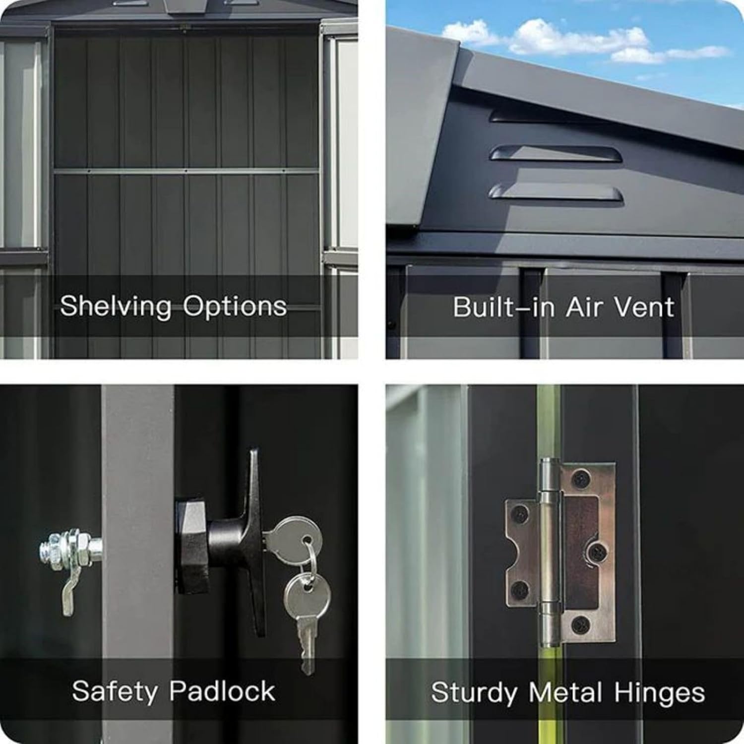 - π¬οΈ Ventilation and UV Protection - Equipped with vents for increased lighting and airflow, this tool shed maintains optimal conditions. Rust-resistant and UV-resistant galvanized steel ensures resilience against all weather conditions, keeping your storage clear and protected.