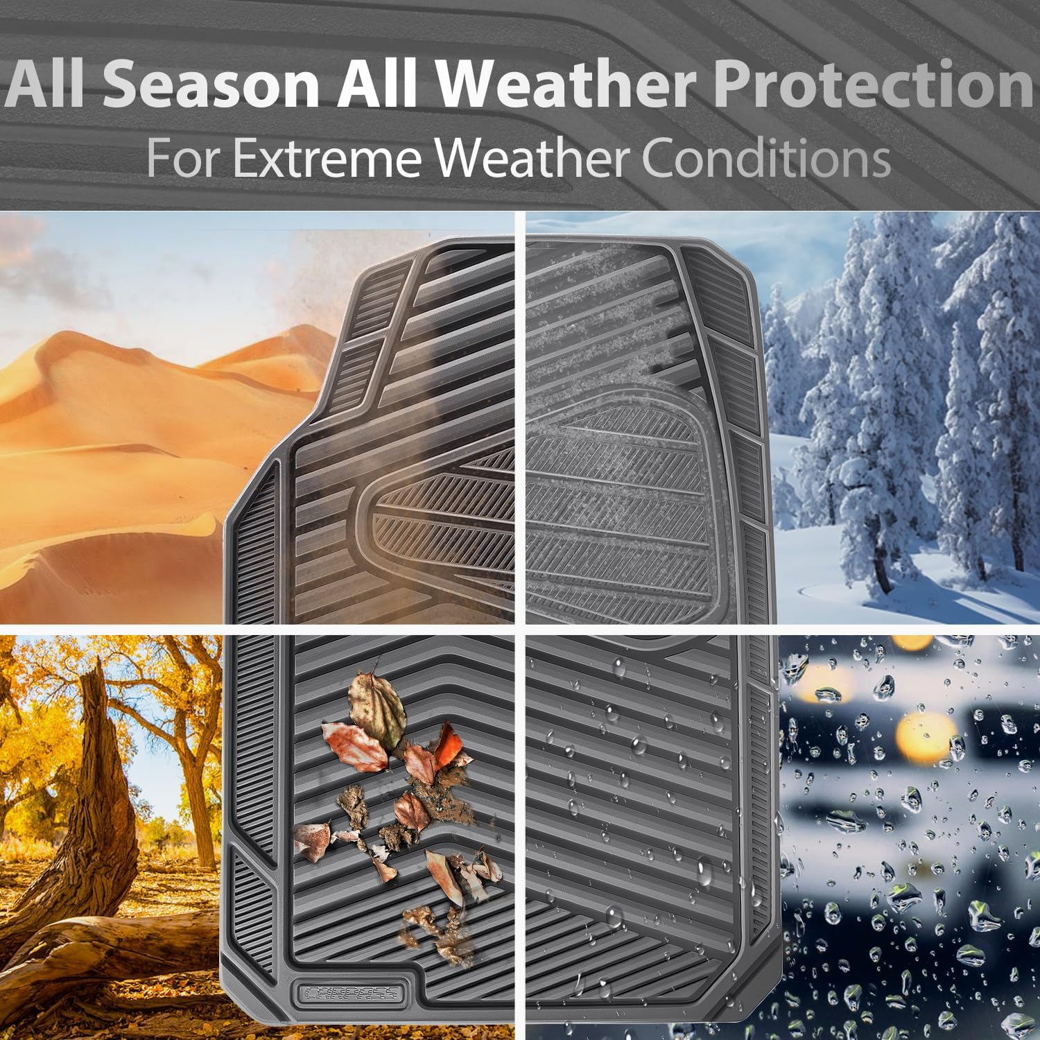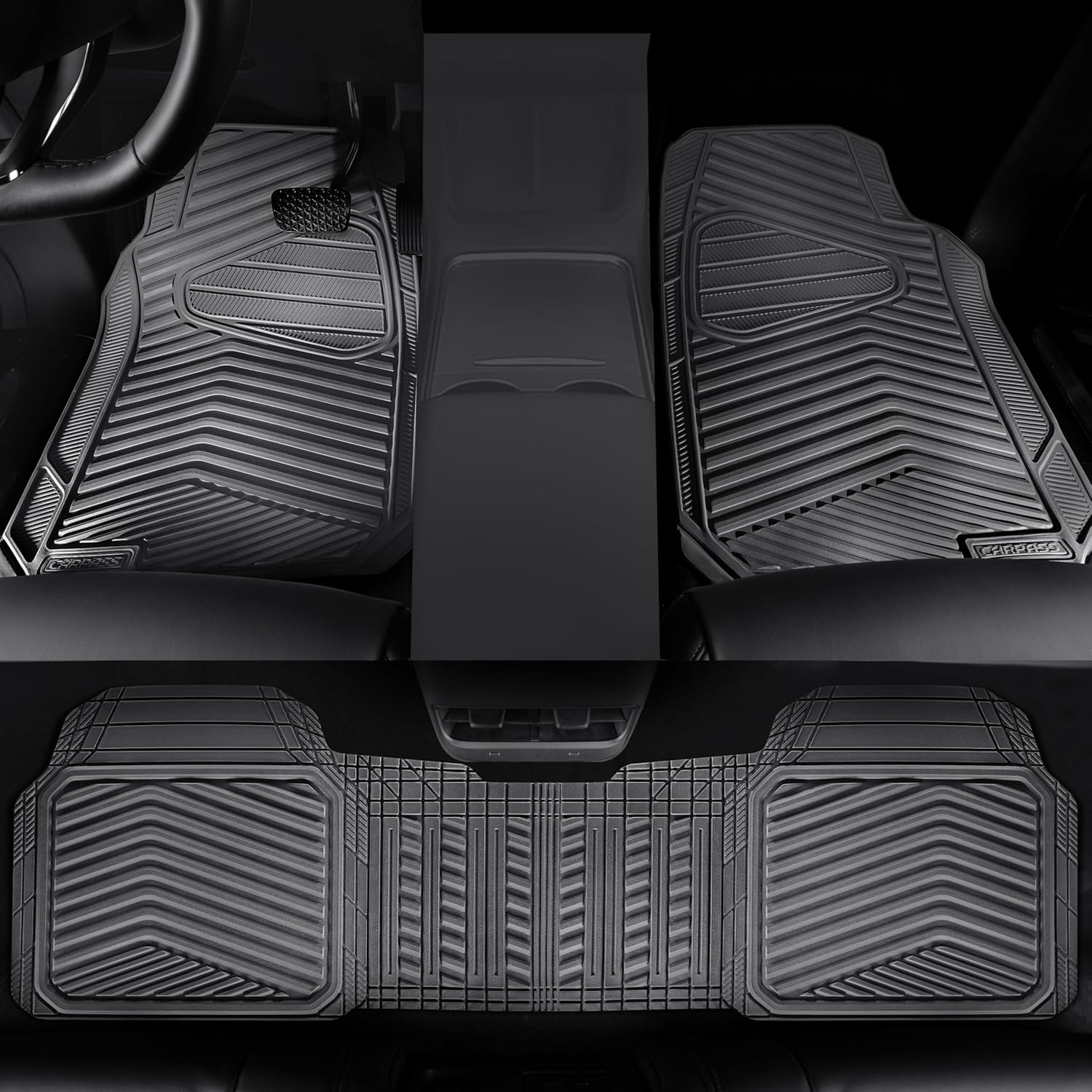 • HEAVY DUTY RUBBER ALL WEATHER FLOOR MATS: CAR PASS all gray heavy duty rubber car mats use for all season.Easy to clean. Made with FlexTough polymers that resist cracking and warping. These grey rubber car mats stay flexible yet strong in extreme temps.specifically design to prevent fluids from leaking onto carpets,the gray automotive floor mats also trap any mud, dirt, water or snow that gets in your car, Ideal for gray car floor mats for cars, gray car floor mats for small trucks, and gray all weather car floor mats needs.