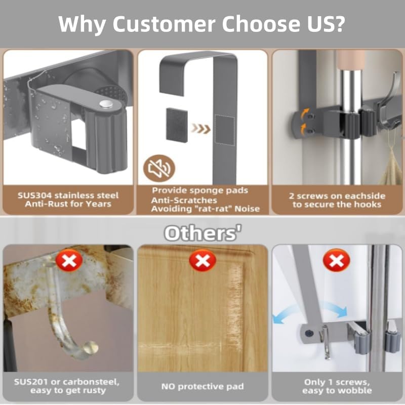 - 4.A must-have for your home: This door broom rack is ideal for your warehouse, kitchen, garage, laundry room. It can centrally store your mops, brooms and other items that need to be hung. The mop rack can firmly hold all items without sliding off. It makes it easier to neatly store the items you need for cleaning