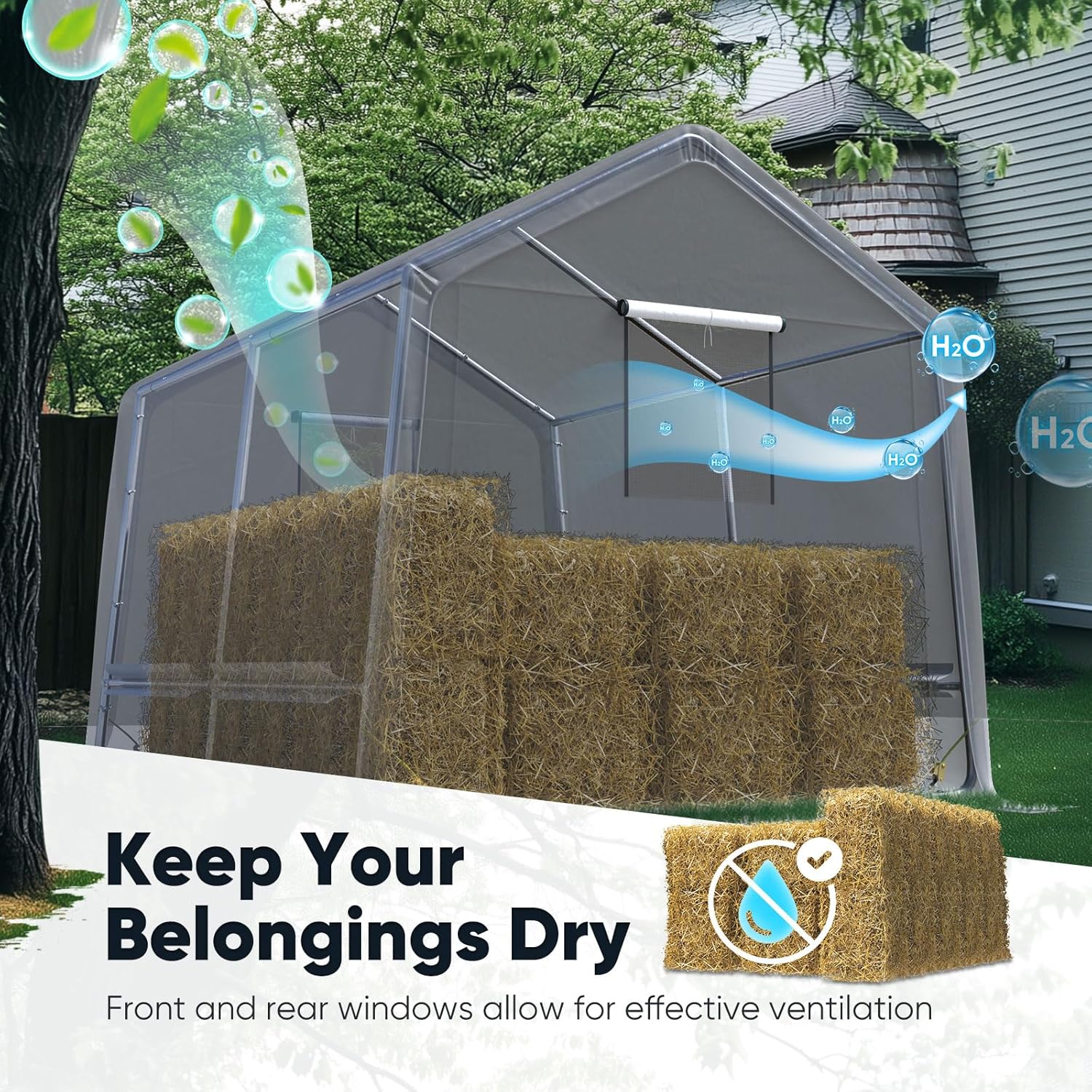 - 【Roll-up Ventilation Windows Design】There are 1 mesh roll-up windows on each door + ceiling airflow channel prevent condensation buildup. ideal for storage Lawn mower and other tools.