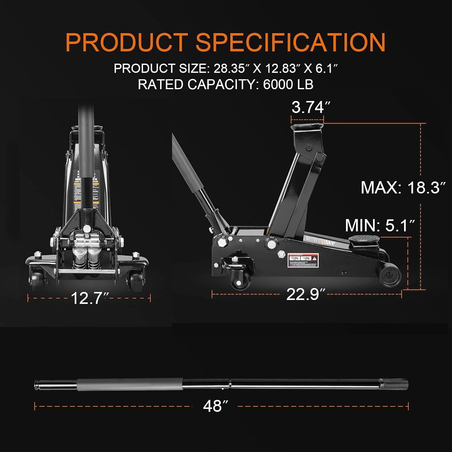 - Hydraulic Car Jack: 3 ton floor jack with a minimum lifting height of 5.12" and a maximum lifting height of 18.31". It can reach the height desired by the user in a short time.