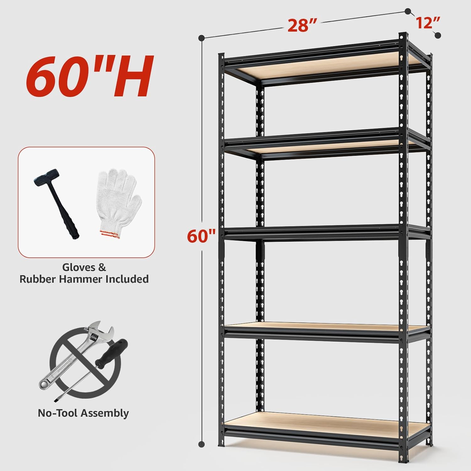 5-Tier Adjustable Metal Storage Shelves Heavy Duty Garage Shelving, 60" H x 28" W x 12" D Shelving Unit Rack for Kitchen, Classroom, Dormitory, Basement & Warehouse