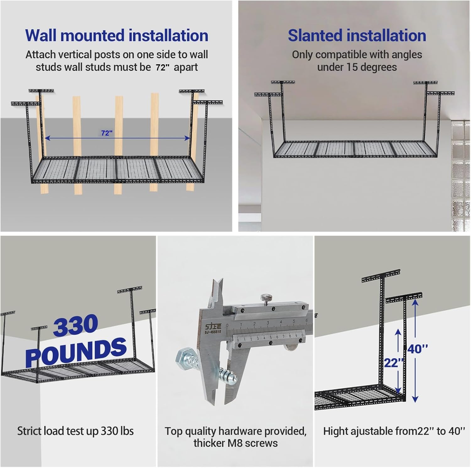 - β Versatile Height Adjustment (22"-40"): Customize your overhead storage rack to fit any ceiling height or storage need. Easily adjust from 22 to 40 inches to maximize vertical space, accommodating tall items in your garage or clearing obstacles in low attic areas. Perfect for seasonal gear or bulky supplies.
