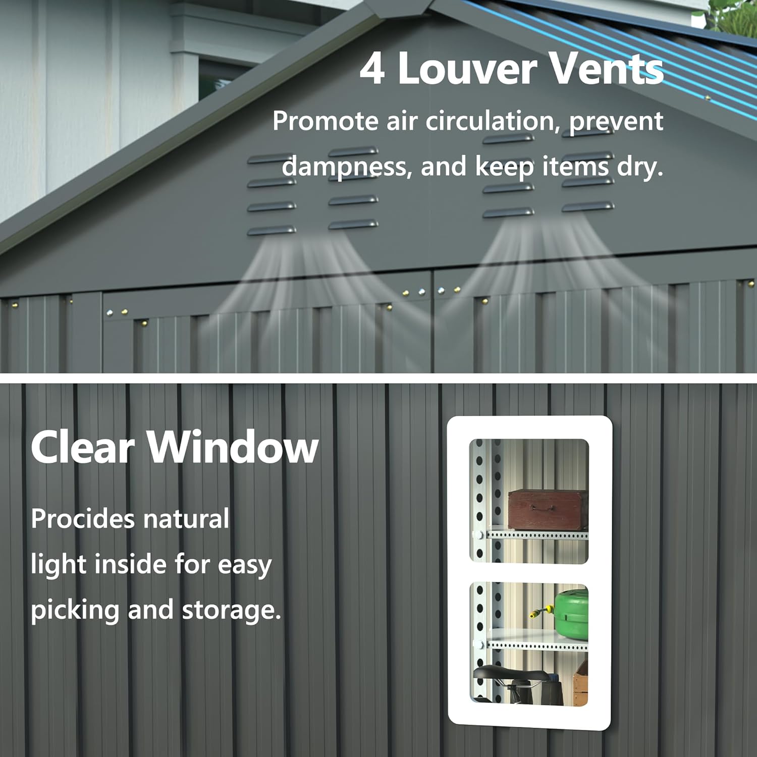 - Ventilation & lighting: 4 vents at the top and one clear window on sidewalls are designed to both increase air circulation and light, keep the storage shed ventilated, not stuffy, reduce odor, allowing you to keep items in the shed dry and avoid mold. And are more suitable for use as garbage bin storage sheds and pet houses, safe and friendly.