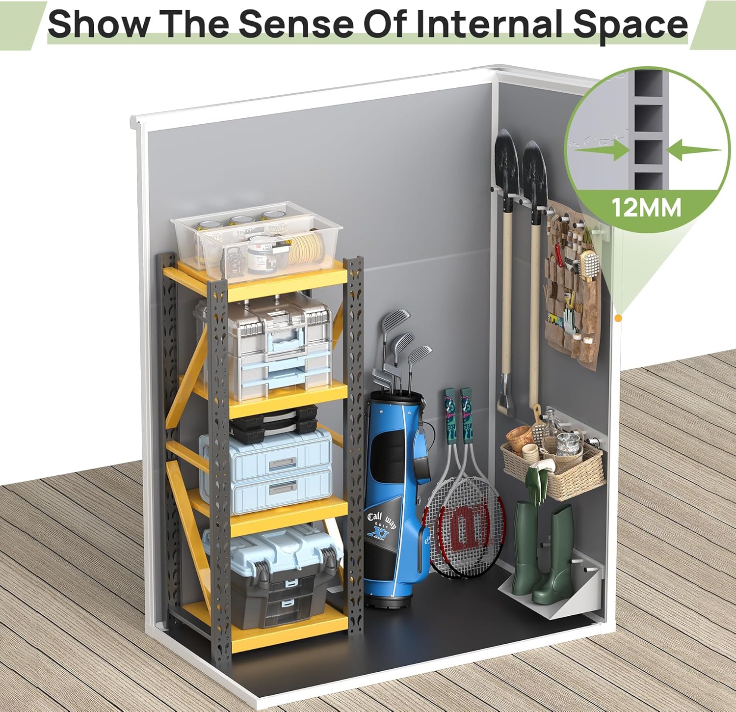 - Lockable door & with floor: Our outdoor shed has a sloped roof that adds extra storage space, prevent rainwater gathering full. Every size with the high strength floor and secure door, ensure the safety of your belongings and prevent accidental entry of small animals.