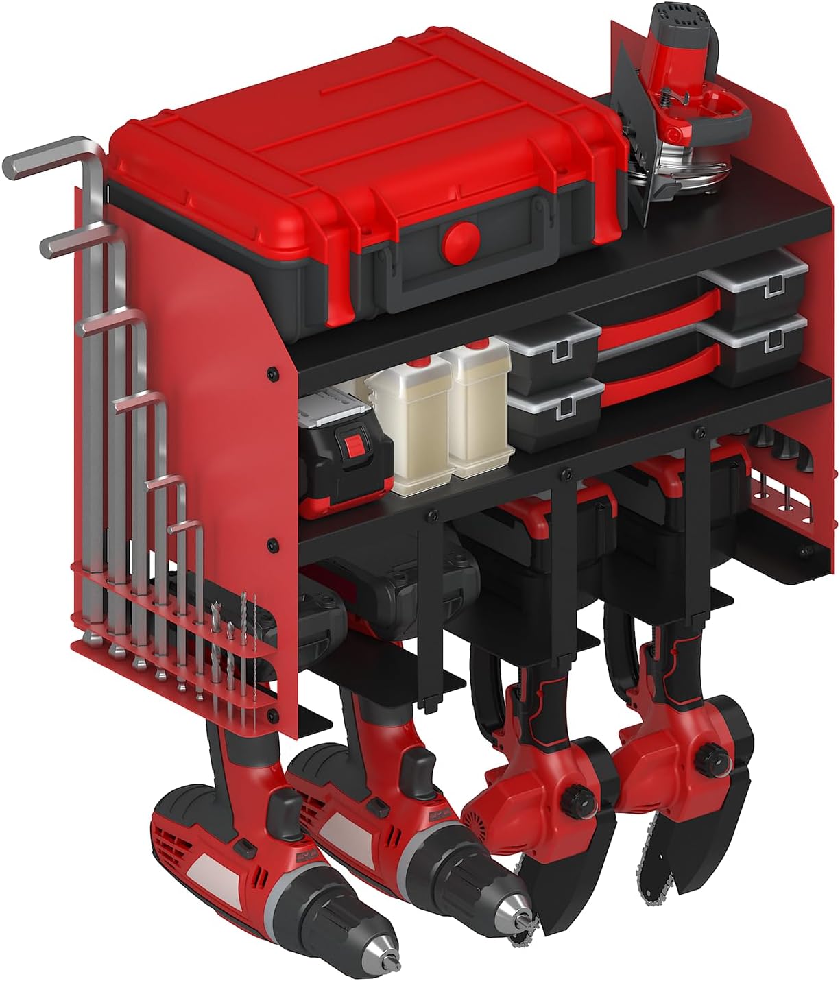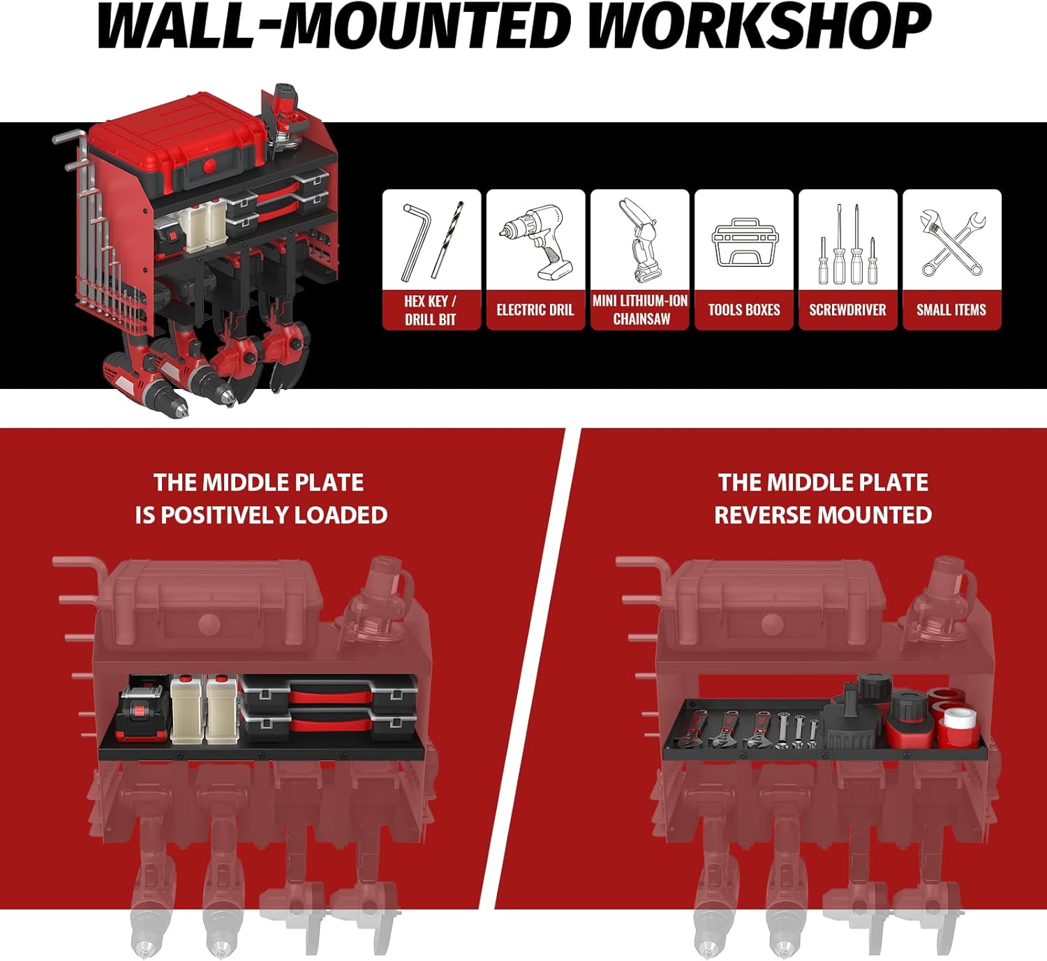 - MULTI-FUNCTIONAL POWER TOOL STORAGE: Power tool storage can be installed according to your needs to the middle of the components, positive installation is the conventional installation, reverse installation is the tray type of tool organizer wall mount, the middle of the shelf has a baffle, you can store some very small items, such as: screws, pins and other easy to fall parts, left and right sides of our design is specifically designed to store screwdrivers, hexagon socket, and other small tools, we designed a two-layer used to fix! These tools, they will not fall over.