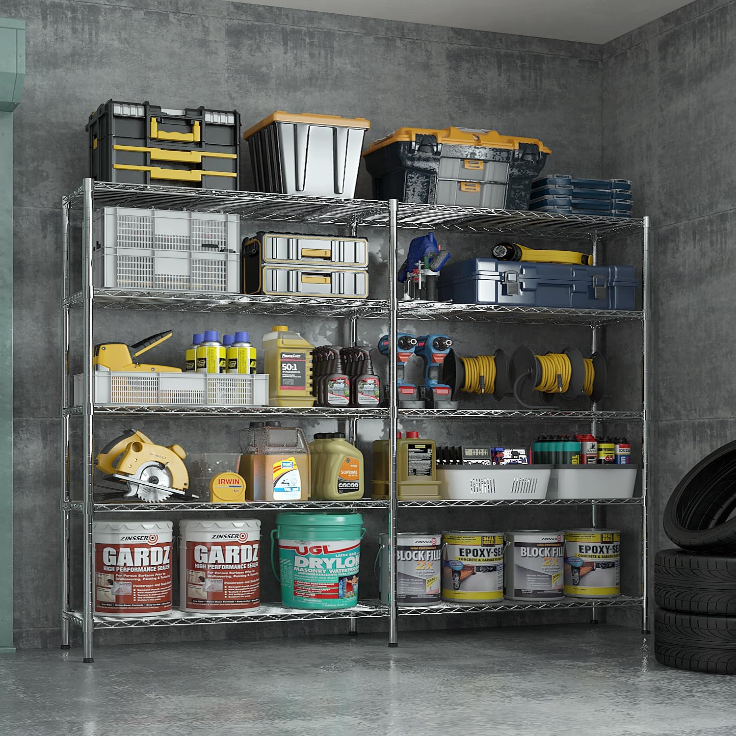 - 【Exceptional 1600 lbs Load - Bearing】Constructed with a dense grid steel frame and reinforced metal supports, this garage shelving is more stable and durable than ordinary racks. With a single - shelf capacity of 320 lbs and a total load - bearing of 1600 lbs, it is rock - solid..