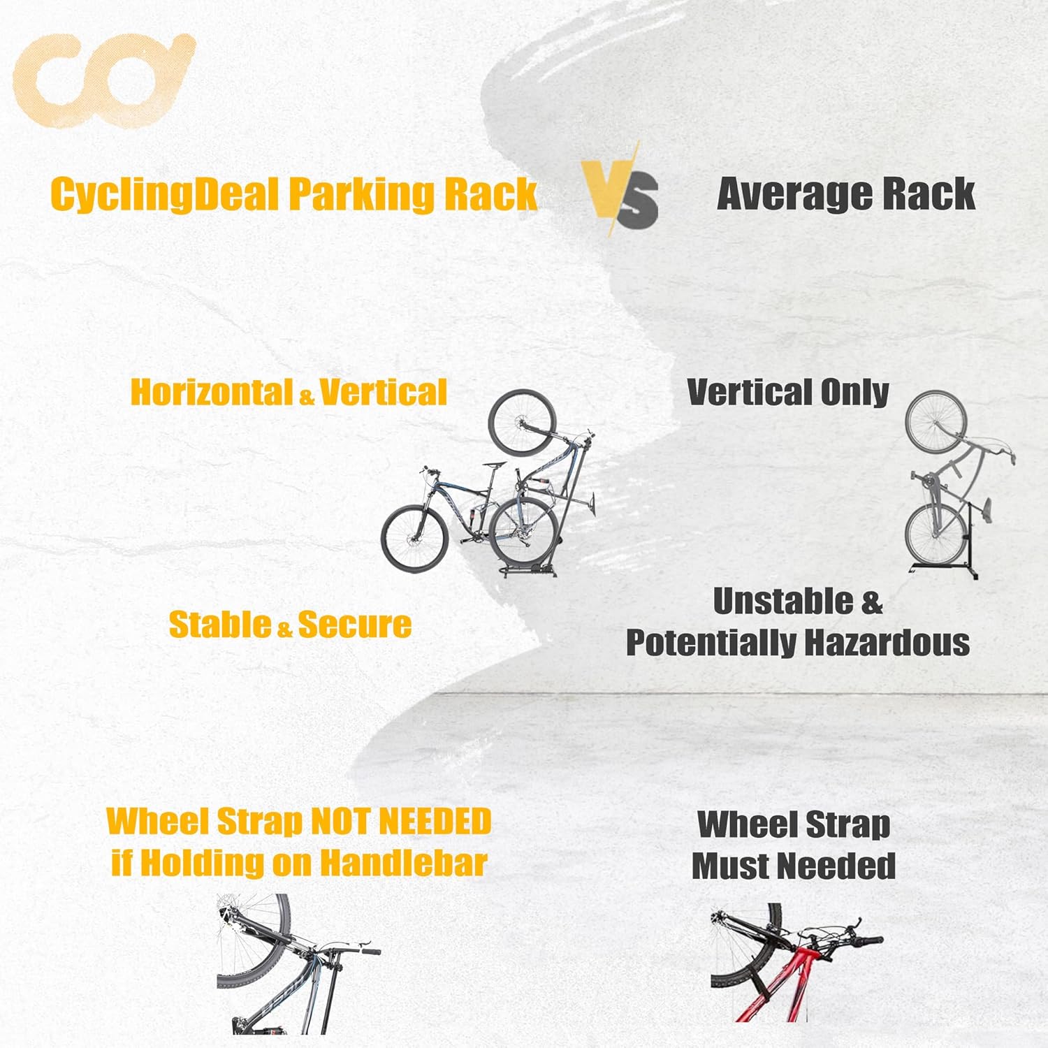 - EFFICIENT BIKE STORAGE SOLUTION - Seeking a smart storage solution to optimize space for your bikes? Our rack offers a versatile 3-way parking design, allowing you to park your bike vertically or horizontally. Keep your bike organized and maximize floor space with ease. Say goodbye to clutter and hello to effortless bike storage!