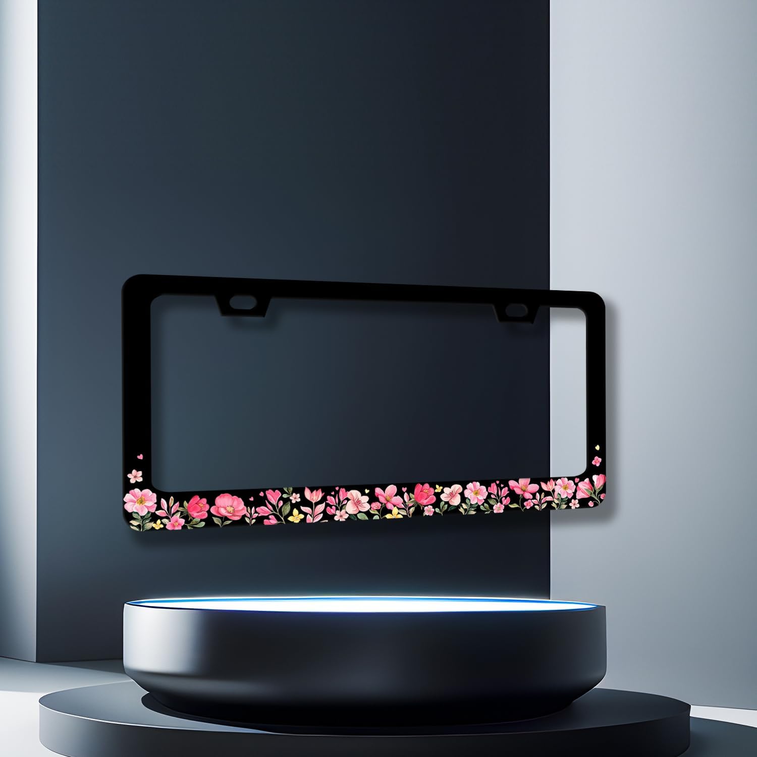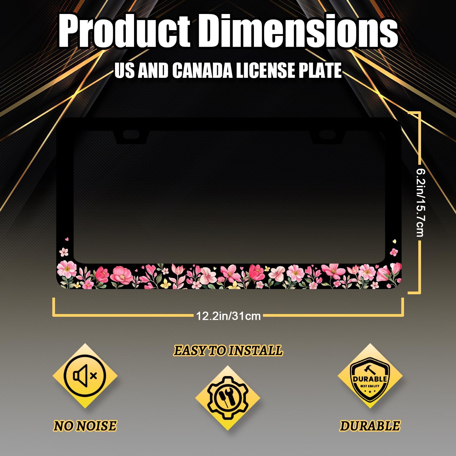 Pink Flowers License Plate Frame Colorful Floral Flower License Plate Stainless Steel Women Accessories Cars Decor 12.2 X 6.2 Inch with 2 Holes and Screws Fits Standard Us Ca Vehicles