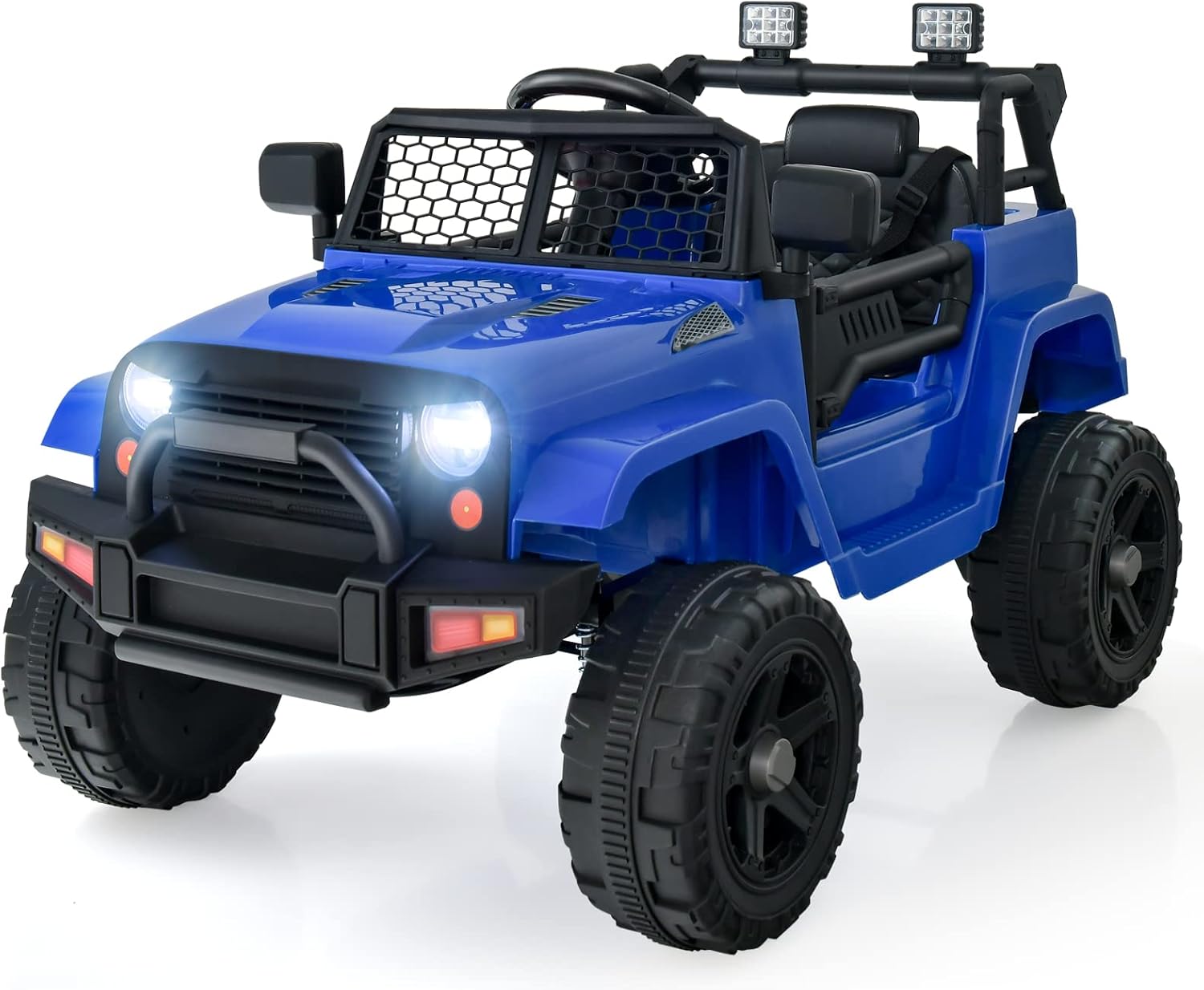 - 12V Electric Ride On Truck: Featuring dual motors, double lockable doors, bright LED headlights and the realistic dashboard, this 12V power wheels toddler car can offer kids real driving experience with 2.5-4.5 km/h speed