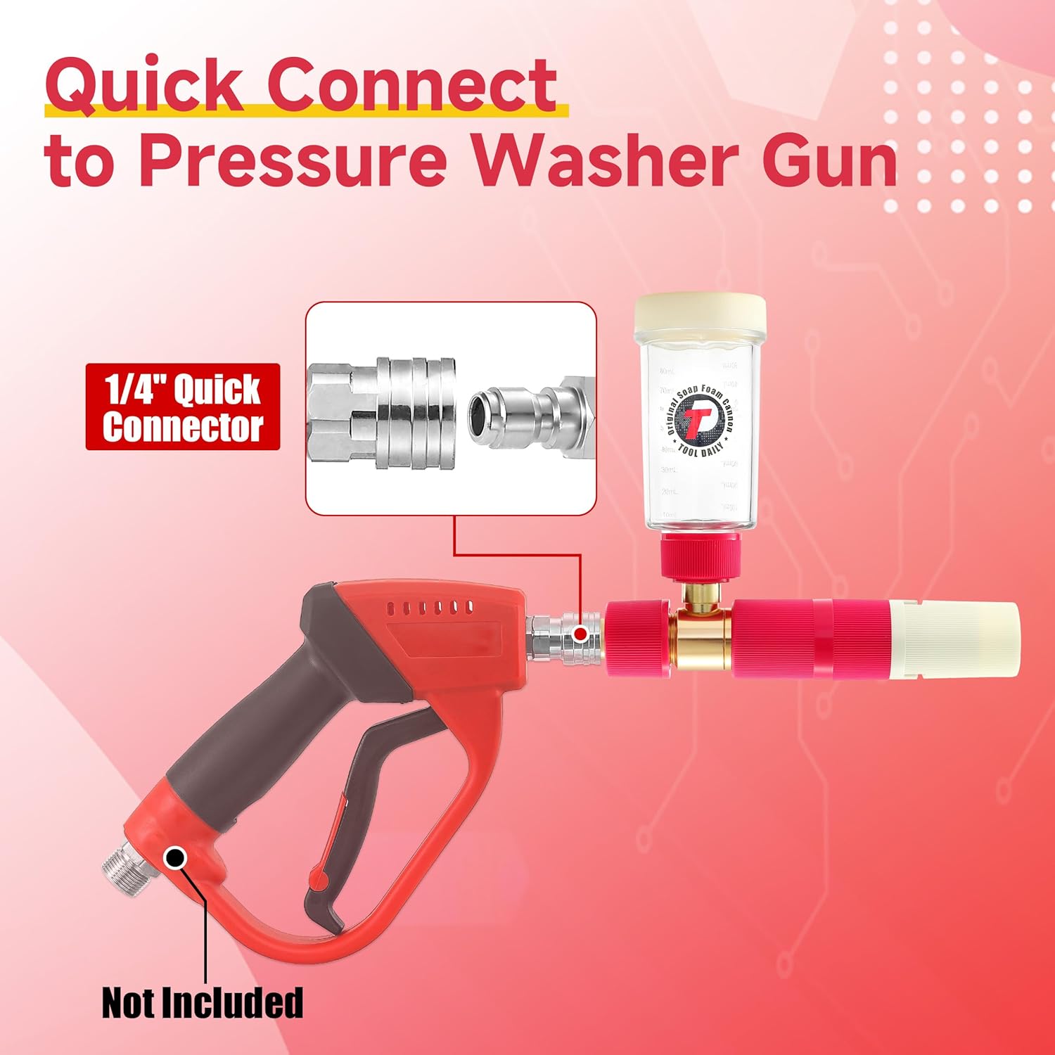 • EASY TO USE: Equipped with a 1/4” quick connector, the power washer foam cannon easily attaches to pressure washer guns or wands for quick setup. Before use, ensure the bottle is upright to allow the soap to flow properly