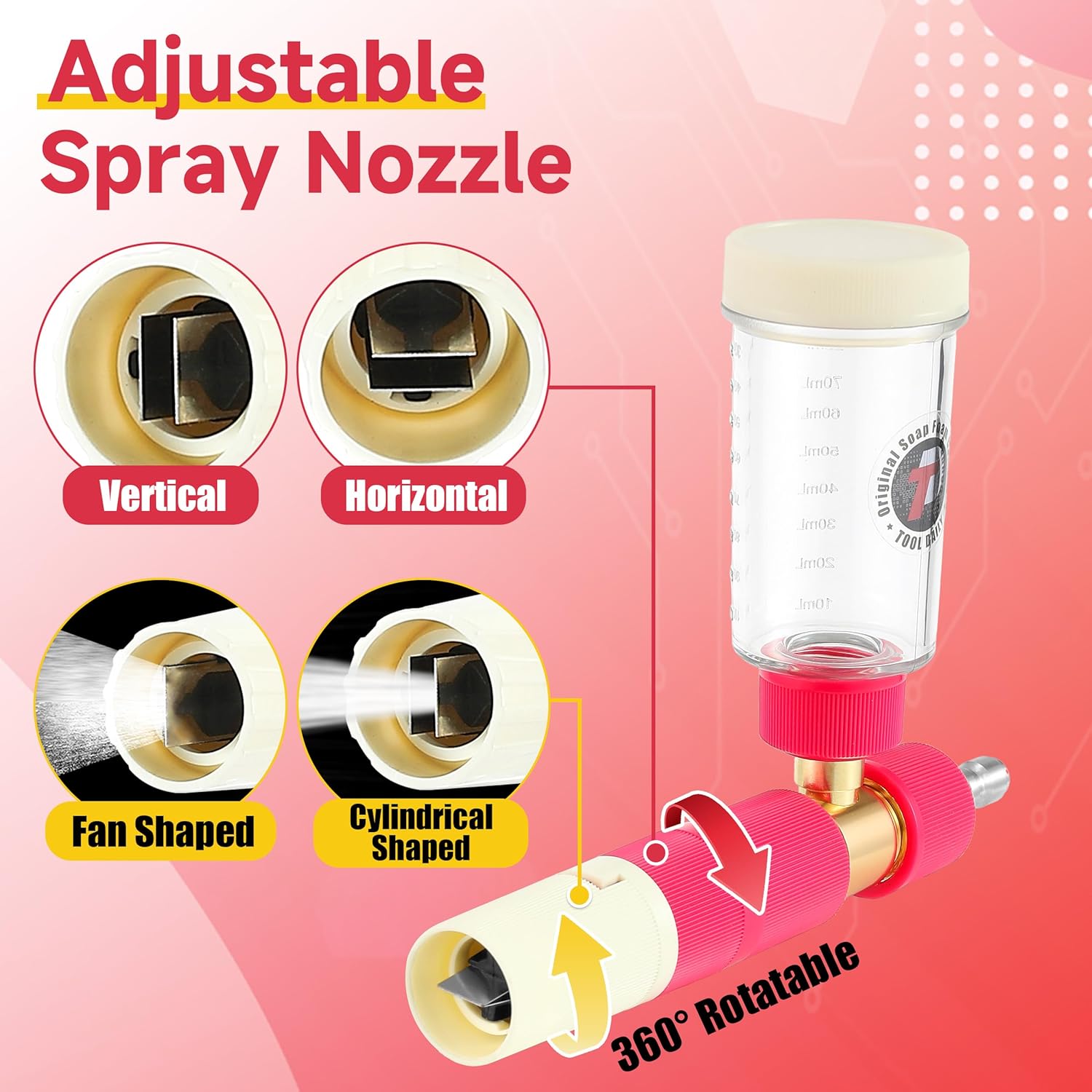 • ADJUSTABLE NOZZLE: The car wash soap sprayer features a fully adjustable nozzle, allowing you to customize the spray pattern and direction. The white adjustment lets you switch from a fan-shaped spray to a more focused cylindrical shape, while the pink adjustment lets you change the spray direction from vertical to horizontal, ensuring you to tackle all your cleaning needs with ease