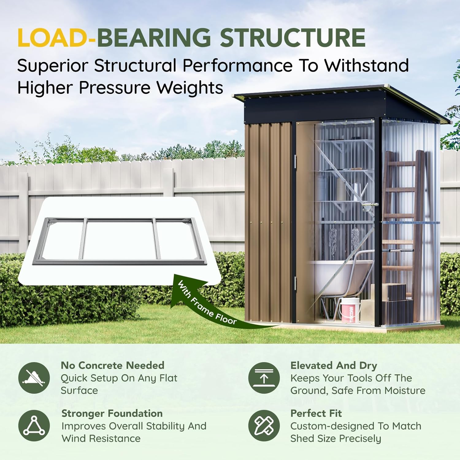 Breezz 5x3FT Vertical Outdoor Steel Storage Shed with Floor Frame, Lockable Doors, Compact Metal Tool Shed for Garden, Backyard, Patio, Utility, and Bike Storage,Brown