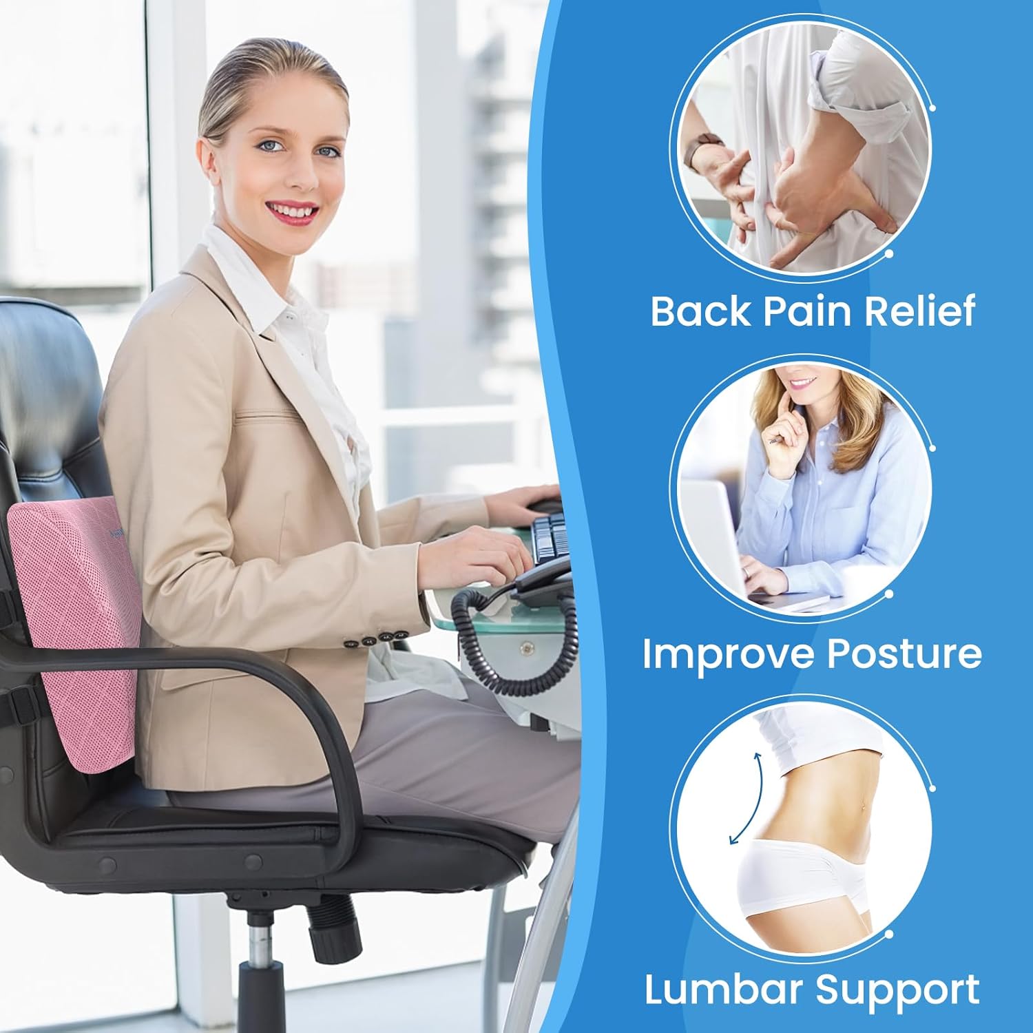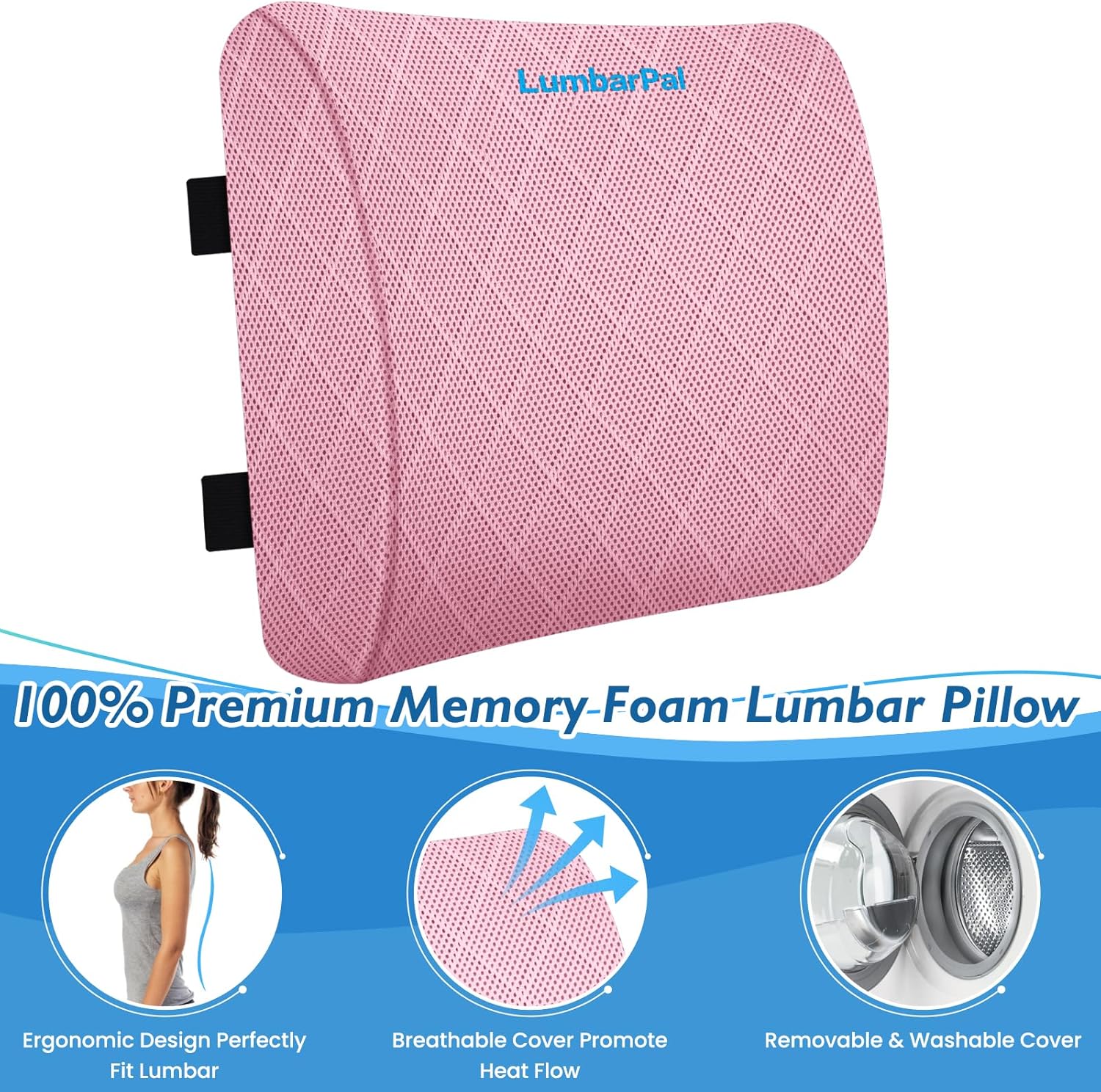 Lumbar Support Pillow for Office Chair Back Support Lumbar Pillow for Car, Gaming, Office Chair - Improve Sitting Posture & Back Pain Relief, Memory Foam, Adjustable Straps, Pink