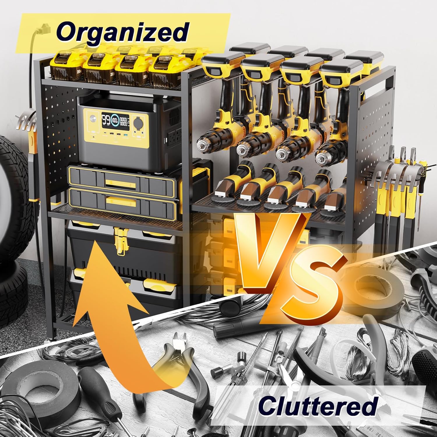 - BUILT-IN 3-OUTLET CHARGING STATION: Power up to 3 tools simultaneously right on your power tool organizer cart! Features a secure power strip (125V/12A/1500W) with a 6.56ft cord, preventing over current, overcharging, or overheating. Never hunt for outlets again.