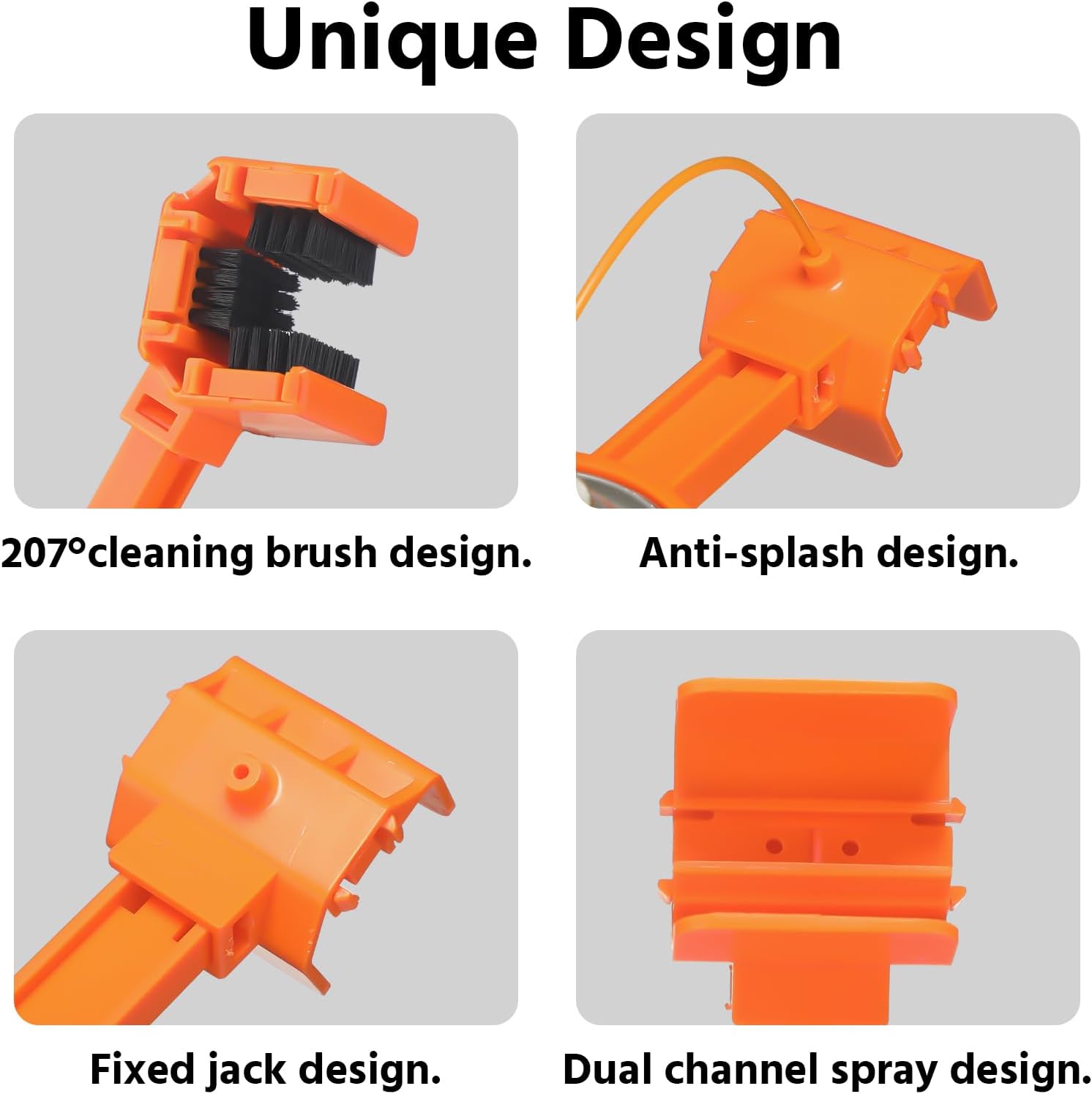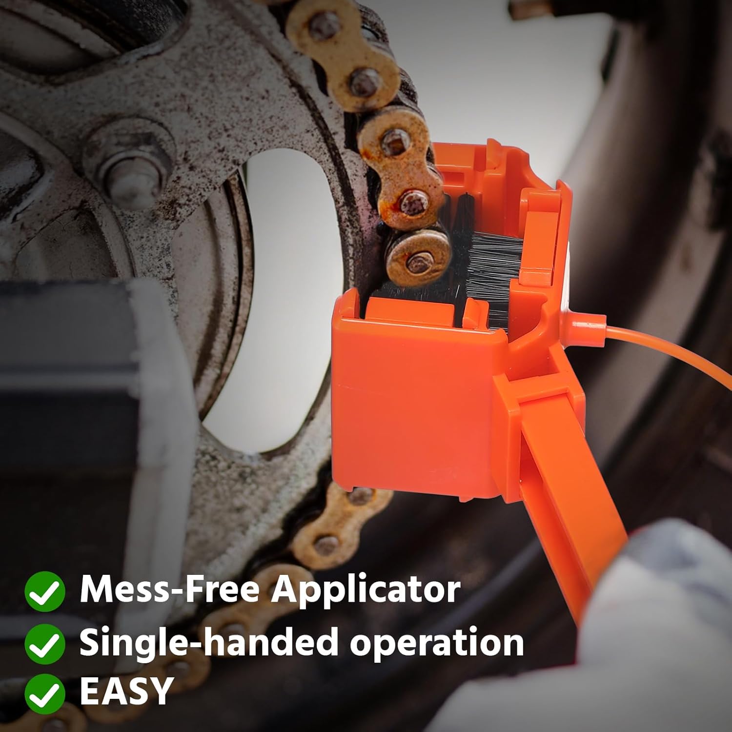 - Efficient Cleaning: the motorcycle chain brush features a 270° design to clean three sides of the chain at once; This bike chain lube tool works seamlessly with most spray cans (except aluminum) for hassle free maintenance