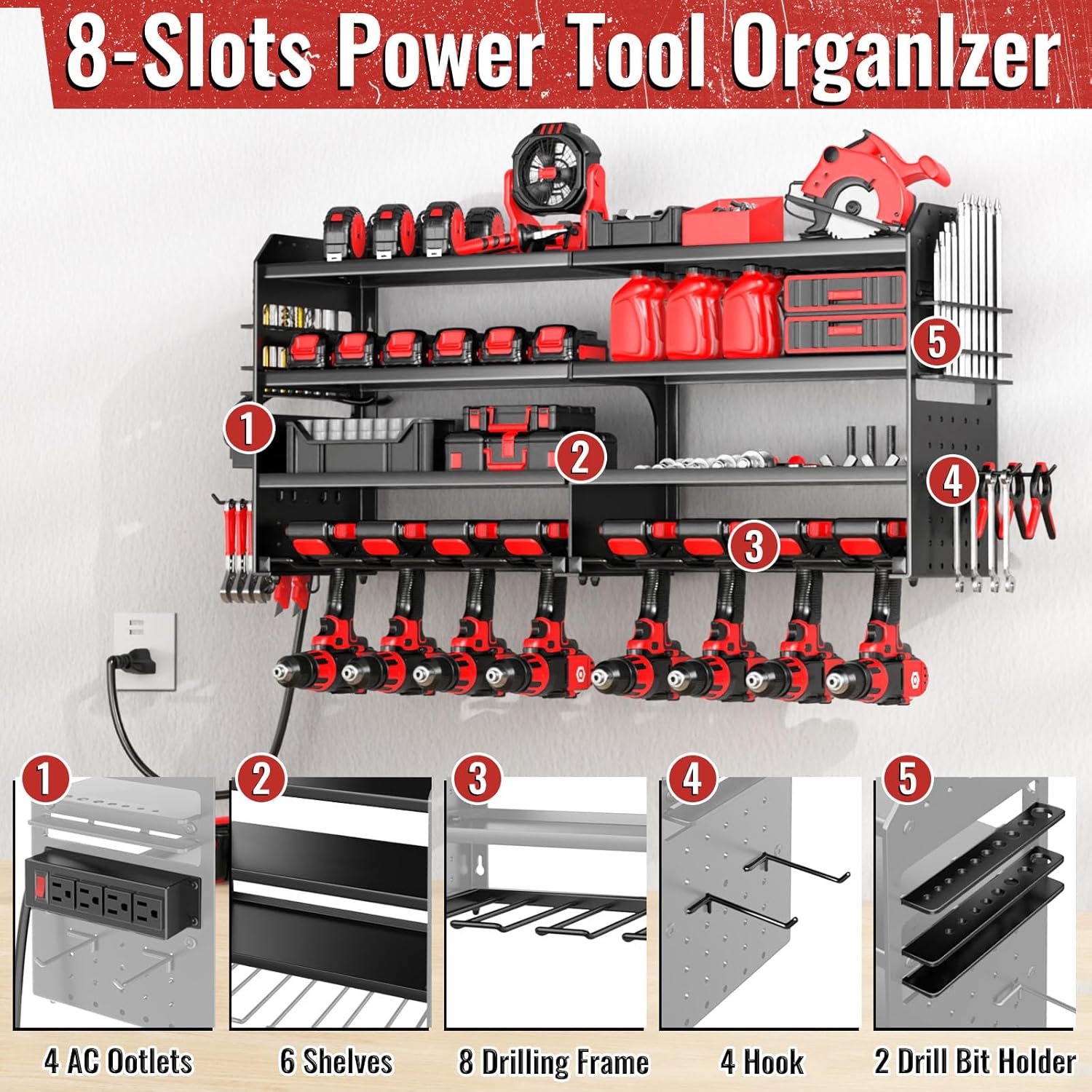 - 4 Layer Tool Storage Rack: This Power Tool Organizer with power strip features 2 side drill bit racks, 4 shelves, 8 drill slots, and an 1 four-outlet power strip, making it your all-in-one solution. From power tool accessories to workshop essentials, there's room for everything you need to stay organized and productive.
