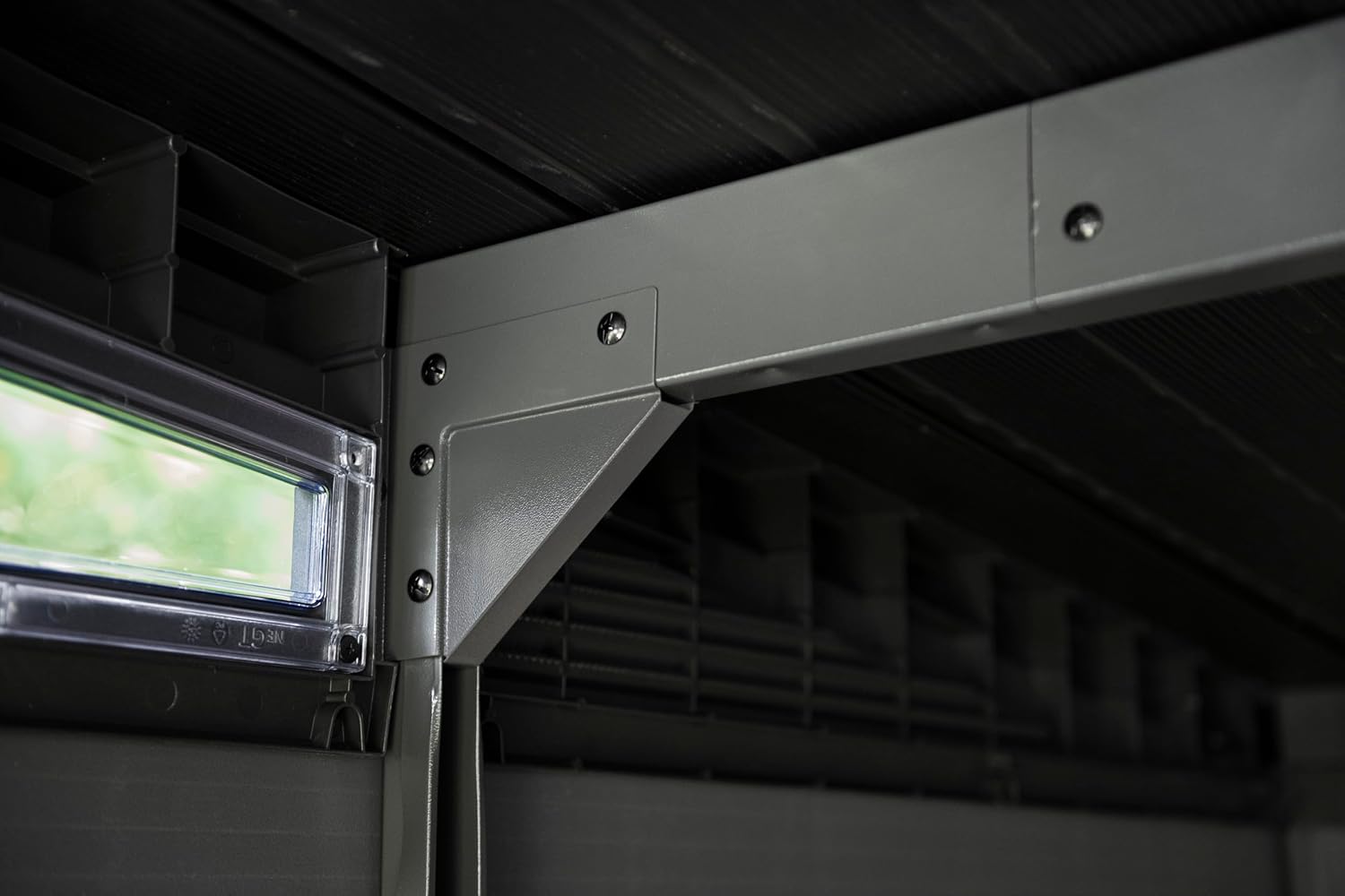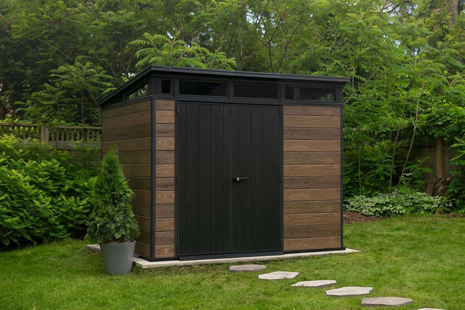 Keter Signature Collection 9x7 Ft All-Weather Storage Shed with Skylight, Window, Built-in Ventilation, Customizable Walls, & Lockable Double Doors, Walnut